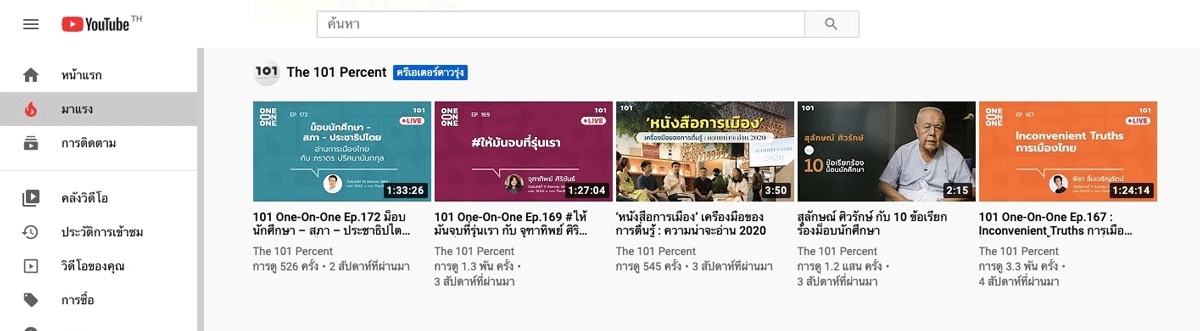 9. ช่อง YouTube The 101 Percent ด้วยคอนเทนต์ที่มีจุดมุ่งหมายที่ต้องการให้ความรู้ เข้าถึงผู้คนในวงกว้างขึ้น และสร้างแรงบันดาลใจให้กับผู้คน ผ่านการสร้างสรรค์คอนเทนต์ของทีมงานที่ผสมผสานนักวิชาการ นักวิจัย บรรณาธิการ นักเขียน ผู้กำกับ ครีเอทีฟ และกราฟิกดีไซเนอร์ เข้าด้วยกันเป็นเนื้อเดียว รวมทั้ง พยายามเชื่อมร้อย ‘โลกแห่งความรู้’ กับ ‘โลกแห่งความคิดสร้างสรรค์’ เข้าด้วยกัน