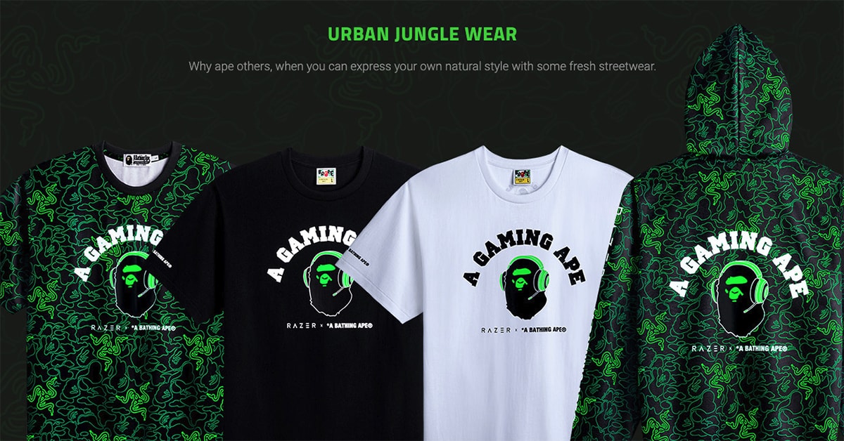 คอลเลกชั่น A GAMING APE นี้ ได้รับแรงบันดาลใจจาก BAPE สร้างสรรค์ออกมาเป็นอุปกรณ์ต่อพ่วงคอมพิวเตอร์ เช่น เมาส์ DeathAdder V2, แผ่นรองเมาส์ Goliathus V2, และหูฟัง wireless รุ่น Opus. นอกจากนี้ แฟน ๆ ยังสามารถแสดงความรักที่มีต่อแบรนด์ได้ด้วยการสนับสนุนคอลเลคชั่นสตรีทแวร์ ที่เป็นที่ต้องการอย่างมากมาย โดยเฉพาะเสื้อฮู้ดและกระเป๋าเป้แบบซิปซึ่งเป็นดีไซน์ใหม่จาก BAPE คอลเลกชั่นนี้ถือเป็นครั้งแรกสำหรับทั้ง 2 แบรนด์ ที่มาออกแบบร่วมกัน เรียกได้ว่าเป็นของที่ต้องมีสำหรับผู้ที่ชื่นชอบทั้ง 2 แบรนด์นี้
