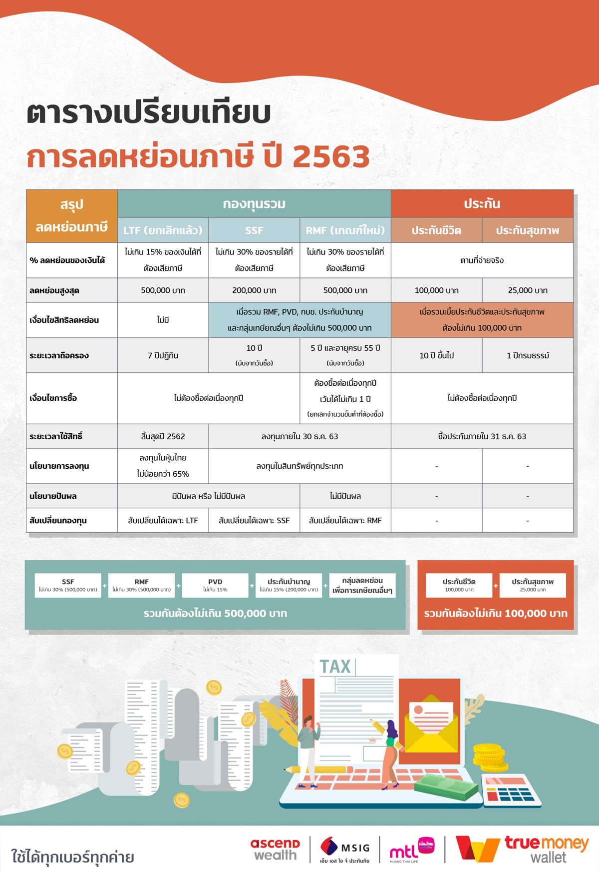 ข้อมูลจาก ธปท. ระบุ ณ เดือนกันยายน 2563 คนไทยมีเงินฝากเฉลี่ยต่อบัญชีเพียง 4,754 บาทเท่านั้น! สวนทางกับความเป็นจริงที่ว่า “เงินออม” เป็นสิ่งที่จำเป็นอย่างมากในทุกช่วงของชีวิต ไม่ว่าจะเป็นช่วงเริ่มต้นทำงานในวัย 24-25 ปี ที่หลายคนต้องการเก็บเงินเพื่อรถคันแรก หรือขยับมาช่วงวัย 28-35 ปี ที่อยากเก็บเงินไว้สร้างครอบครัว บ้านหลังแรก และเป็นทุนการศึกษาให้ลูก หรือแม้แต่ช่วงเกษียณในวัย 60 ปี สำหรับผู้มีรายได้ถึงเกณฑ์เสียภาษีที่ปัจจุบันมีอยู่ประมาณ 11-12 ล้านราย และกลุ่มผู้เสียภาษีหน้าใหม่อย่างวัยเริ่มต้นทำงาน ถึงเวลาแล้วที่ควรเริ่มลงมือวางแผน “ลดหย่อนภาษี” อย่างจริง ๆ จัง ๆ เพราะเป็นสิทธิที่ผู้มีเงินได้พึงได้รับ นอกจากสร้างหลักประกัน ลดค่าใช้จ่าย แถมยังเพิ่มเงินออมเก็บไว้ใช้ตามเป้าหมายที่ตั้งไว้ในอนาคต หากเราวางแผนไว้แต่เนิ่น ๆ ก็จะมีเงินออมใช้จ่ายเหลือ ๆ แบบคูล ๆ และคุ้มค่ายิ่งขึ้นถ้าการลงทุนนั้นสามารถนำไปลดหย่อนภาษีได้อีก ลองตรวจเช็คตารางการลดหย่อนภาษี ทั้งกองทุนรวมและประกันฯ ปี 2563 และคำนวณเงินภาษีที่ต้องจ่ายตามด้านล่างเพื่อเริ่มต้นการเป็นนักลงทุนแบบ Cashless