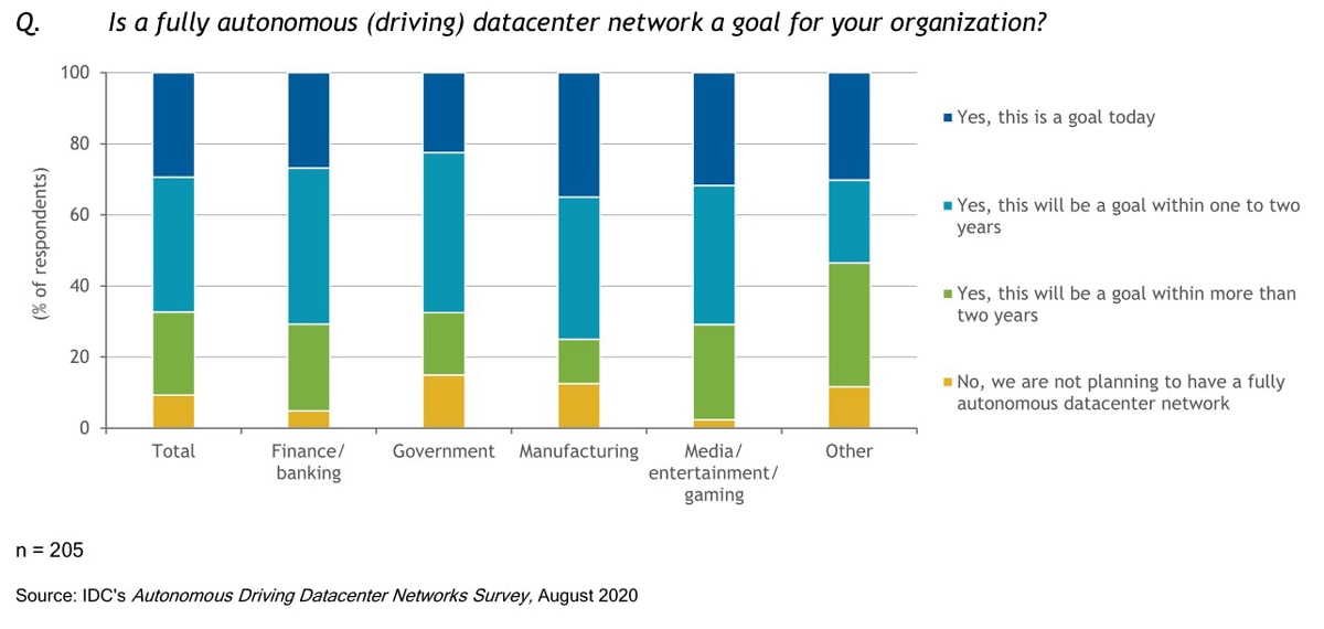 IDC ได้สอบถามองค์กรธุรกิจว่า “การใช้เครือข่ายศูนย์ข้อมูลแบบ (ขับเคลื่อน) อัตโนมัติเต็มรูปแบบนั้นเป็นหนึ่งในเป้าหมายขององค์กรหรือไม่” ซึ่งองค์กรธุรกิจเกือบ 91% ระบุว่านั่นคือเป้าหมายขององค์กรในอีกสองปีข้างหน้า และมีเพียง 9.3% ที่ระบุว่าพวกเขายังไม่มีแผนที่จะใช้เครือข่ายศูนย์ข้อมูลอัตโนมัติเต็มรูปแบบ