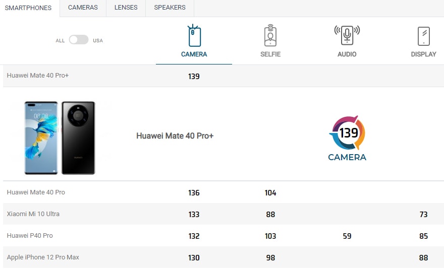หากดูจากรูปข้างบน จะพบว่าสมาร์ทโฟนของ Huawei นั้นติดใน top 5 เรื่องคะแนนกล้องหลังของ DxOMark ถึง 3 อันดับ ได้แก่ Mate40 Pro+ อันดับ 1 , Mate40 Pro อันดับ 2 และ P40 Pro ที่อันดับ 4