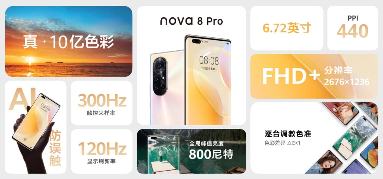 ส่วน Huawei Nova 8 มาพร้อมกับสเปคที่ลดลงเล็กน้อยเมื่อเทียบกับรุ่นPro โดยมีหน้าจอ OLED FHD+ ขนาด 6.57 นิ้วพร้อมอัตรารีเฟรช 90Hz และเจาะรูตรงกลางจอสำหรับกล้องหน้า 32MP ตัวบอดี้หนา 7.65 มม. และน้ำหนัก 169 กรัม ส่วนสเปคที่เหลือของ Huawei Nova 8 ก็เหมือนกับ Nova 8 Pro นั่นเอง