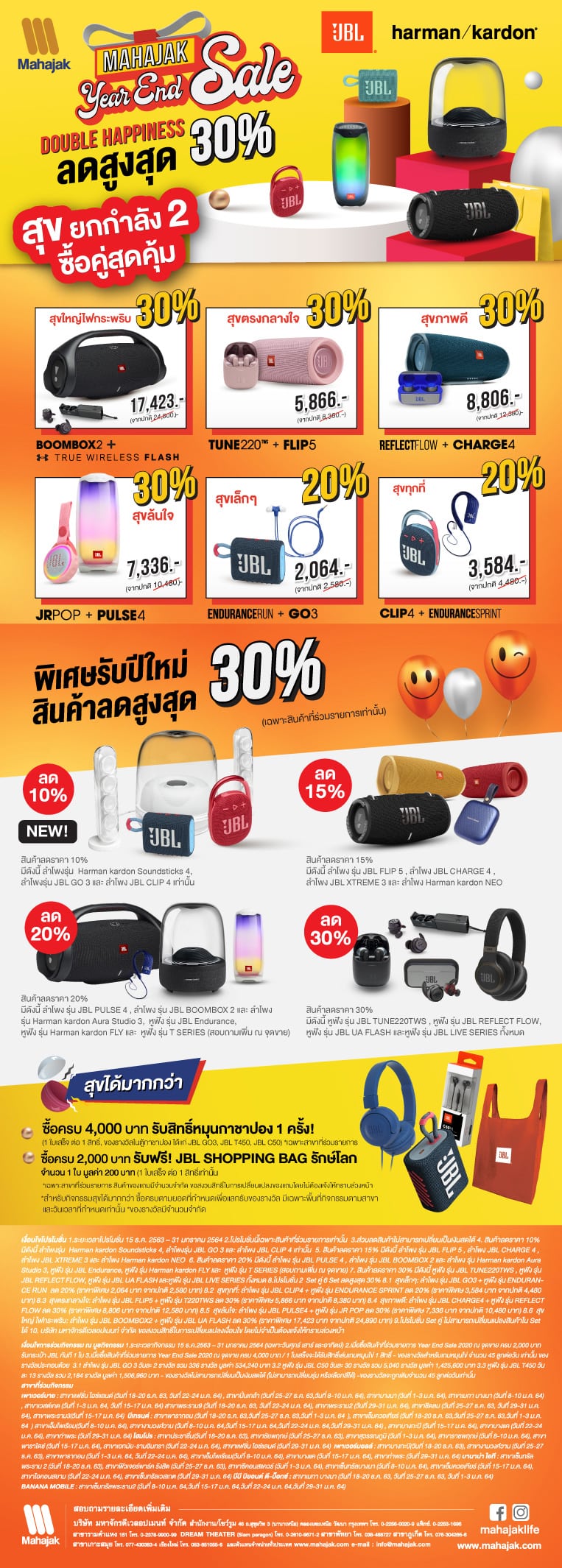 MAHAJAK YEAR END SALE 2020 สุขส่งท้ายปี กับสินค้าลำโพง และหูฟัง JBL, HARMAN KARDON ลดสูงสุด 30% พร้อมสุขยกกำลัง 2 ซื้อคู่สุดคุ้ม!! และร่วมสนุกกับบูธกิจกรรม ณ จุดขายที่ร่วมรายการ