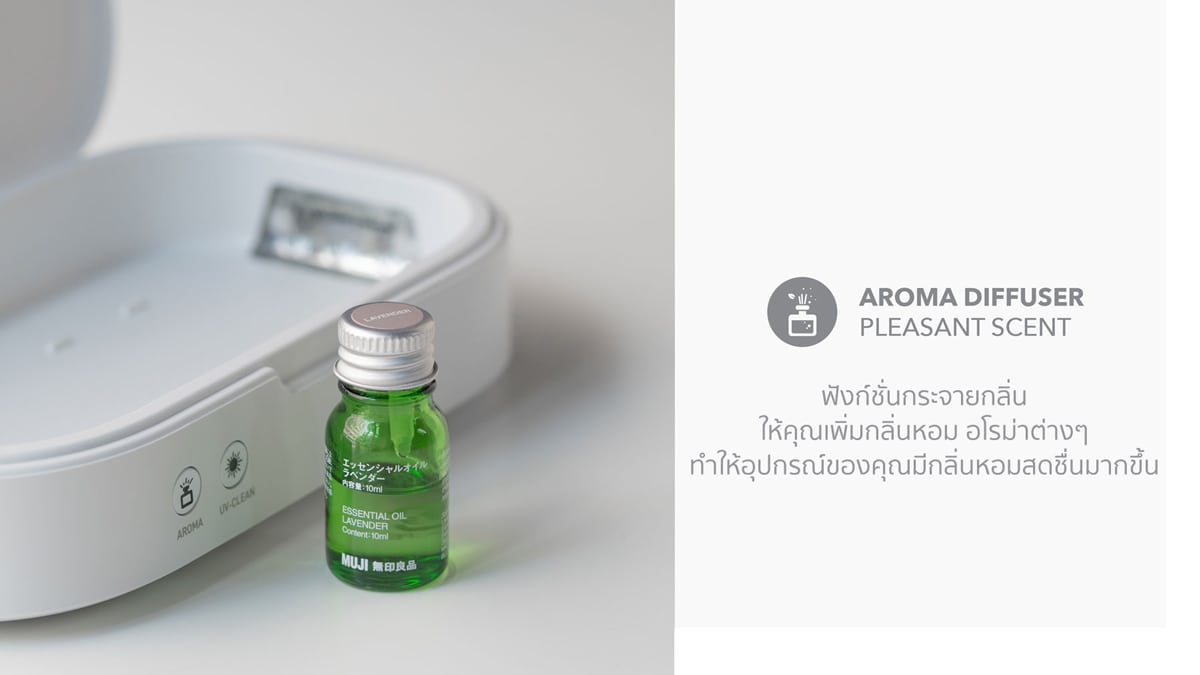 และแบคทีเรียได้ 99.9% รวดเร็วภายใน 10 นาที ที่สำคัญสามารถฆ่าเชื้อโรคบนอุปกรณ์ ที่ไม่ต้องการความร้อนได้อย่างปลอดภัย เช่น นาฬิกา แว่นตา ต่างหู สร้อยคอ/ข้อมือ กระเป๋าสตางค์ ธนบัตร และบัตรต่างๆ รวมถึง Smartphone, Smartwatch, Airpods และอื่นๆ ได้ พร้อมด้วยฟังก์ชั่นกระจายกลิ่นให้คุณเพิ่มกลิ่นหอม อโรม่า ให้ความสดชื่นมากขึ้นได้ตามที่คุณต้องการ ผ่านการทดสอบในห้องปฏิบัติการว่าสามารถฆ่าเชื้อโรคและแบคทีเรียได้ถึง 99,9% จากอุปกรณ์ที่ไม่สามารถล้างทำความสะอาดของคุณได้