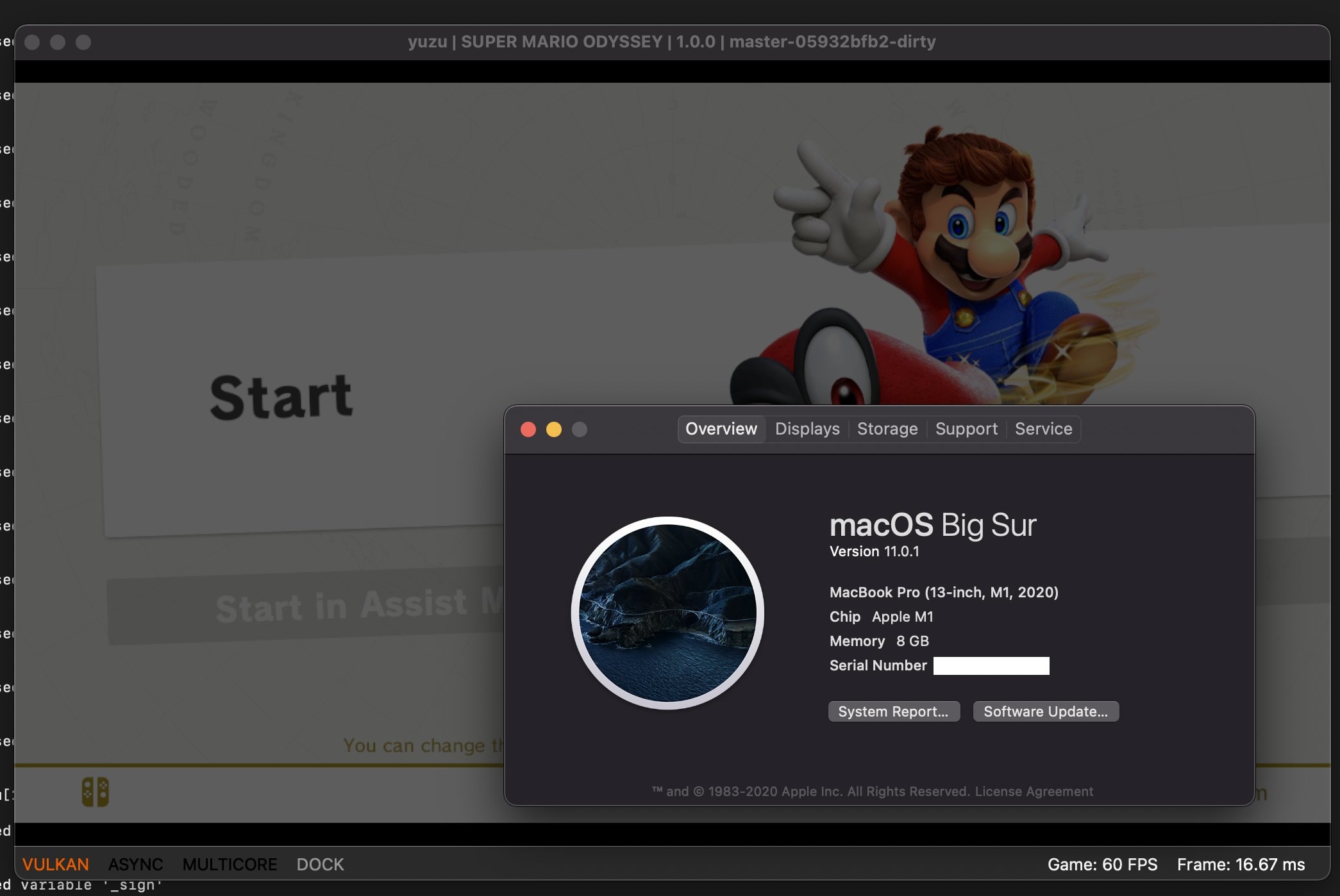 ภาพหน้าจอที่ถูกแคปมานี้เผยให้เห็นเกม Super Mario Odyssey ที่ทำงานบน MacBook Pro ขนาด 13 นิ้วที่ใช้ชิปเซ็ต M1 และ macOS 11.0.1 โดยตัวแปรที่ทำให้สิ่งนี้เกิดขึ้นได้เป็นเพราะ Nintendo Switch และ Macs M1 ใช้ชิป Arm Silicon ทั้งคู่