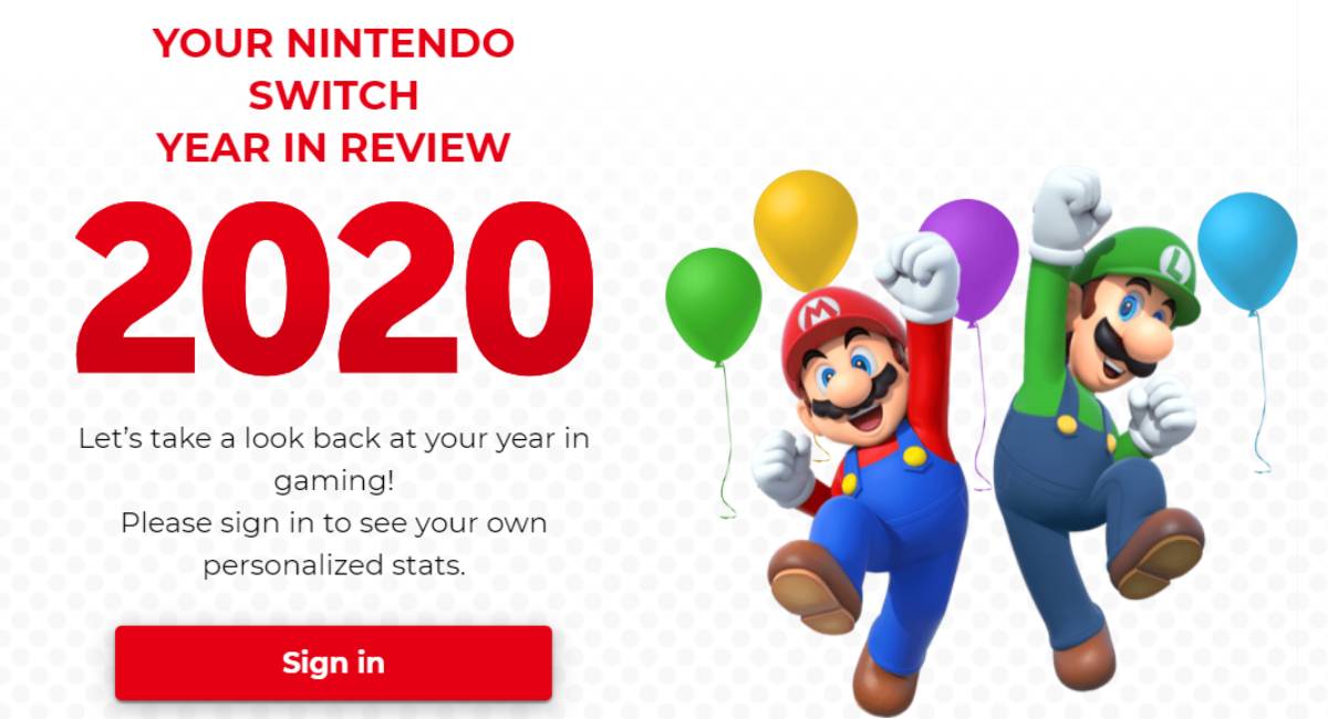 ปีนี้เว็บไซต์จะไม่แสดงวันที่คุณเปิด Switch ครั้งแรกและเกมแรกที่คุณเล่นบนคอนโซลอีกต่อไป แต่จะยังคงแสดงเกมที่มีการใช้งานมากที่สุดของคุณตลอดจนกิจกรรมรายเดือนในรูปแบบกราฟแท่งพร้อมจำนวนชั่วโมงที่คุณใช้ในการเล่นต่อเดือน มีแผงคะแนน My Nintendo Gold ที่คุณได้รับตลอดทั้งปีและลิงก์ที่จะนำคุณไปยังหน้าแลกรับรางวัลอีกด้วย