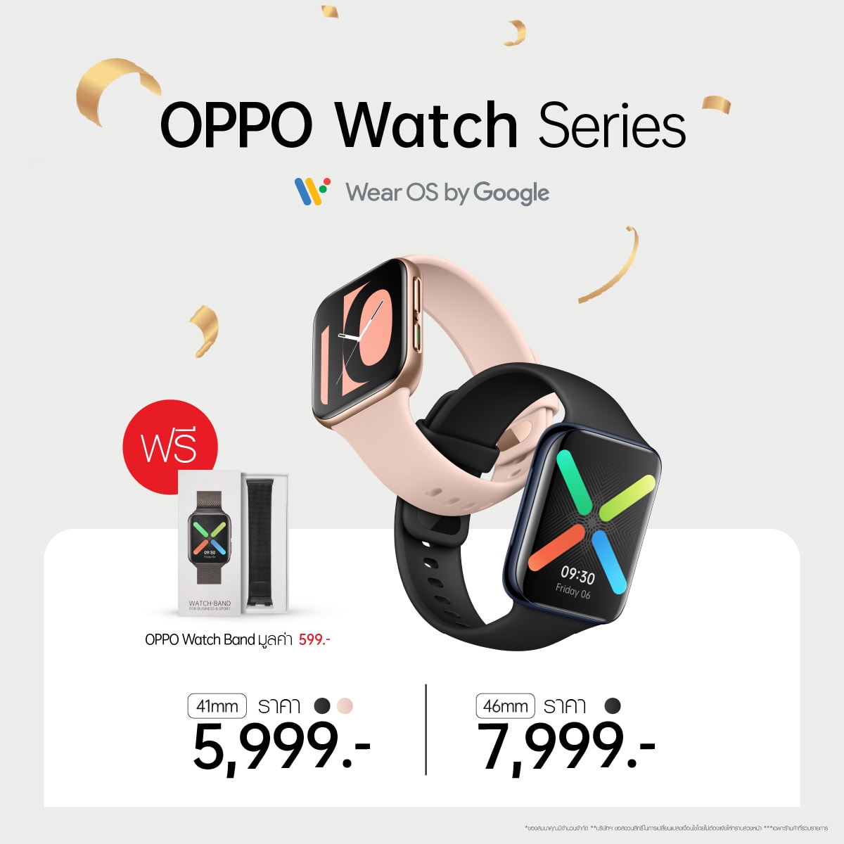 สำหรับOPPO Watch Series สมาร์ทวอร์ชรุ่นแรกจาก OPPO ที่ทำงานบน Wear OS by Google ™ โดดเด่นด้วยดีไซน์เบาสบายสวมใส่ง่าย พร้อมฟีเจอร์ครบครัน ให้คุณเชื่อมต่อทุกไลฟ์สไตล์ที่เป็นคุณ ไม่ว่าจะเป็น AI Outfit ที่ให้คุณสามารถออกแบบดีไซน์หน้าปัดได้ตามสไตล์การแต่งกายของคุณ หรือ ระบบประมวลผลการออกกำลังกายที่สามารถรองรับการออกกำลังกายได้ถึง 5 โหมด โดย OPPO Watch Series ประกอบด้วย OPPO Watch 46mm ราคา 7,999 บาท และ OPPO Watch 41mm ราคา 5,999 บาท พร้อมรับฟรี! OPPO Watch Band หรือ สายนาฬิกาดีไซน์เก๋ มูลค่า 599 บาท