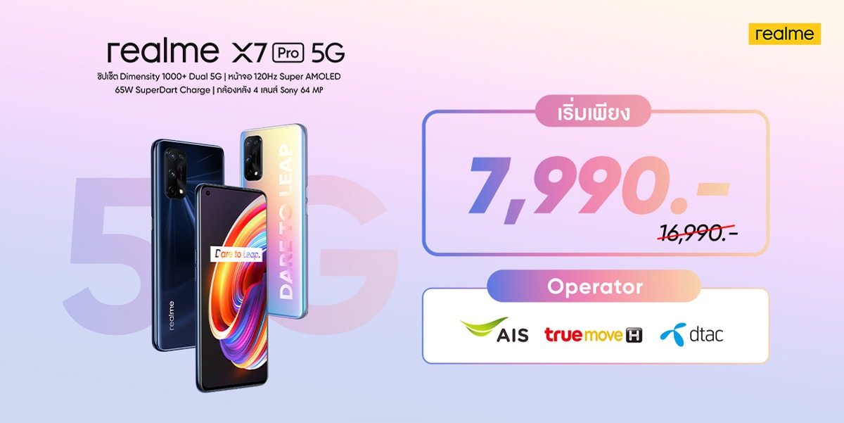 สำหรับช่องทาง Operator อย่าง AIS, Truemove H และ dtac สามารถเป็นเจ้าของ realme X7 Pro 5G ความจุ 8+128 GB ในราคาเริ่มต้นเพียง 7,990 บาท จากปกติ 16,990 บาท พร้อมโปรโมชั่นผ่อน 0% นานสูงสุด 24 เดือน แถมฟรี! กระเป๋าเป้ realme Jet Black Bag มูลค่า 1,890 บาท และประกันตัวเครื่องนาน 24 เดือน เมื่อซื้อภายในวันที่ 10 มกราคม 2564