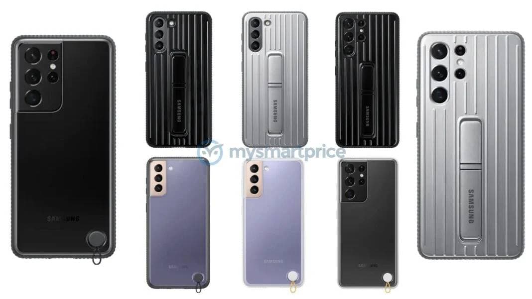 ภาพหลุดเคสอย่างเป็นทางการของ Galaxy S21 series ถูกเผยแพร่โดย Ishan Agarwal และ MySmartPrice เผยว่า Samsung จะเปิดตัวเคสหลายรุ่นสำหรับ Galaxy S21 series ที่มีการออกแบบที่แตกต่างกันและผลิตโดยใช้วัสดุที่แตกต่างกัน เช่น Clear view, เคส LED, Led View, เคส Silicone, เคสหนัง, เคสขาตั้ง Protective Standing และเคสบางตัวจะปิดโมดูลกล้องด้านหลังจนเห็นแค่เพียงเลนส์เท่านั้น