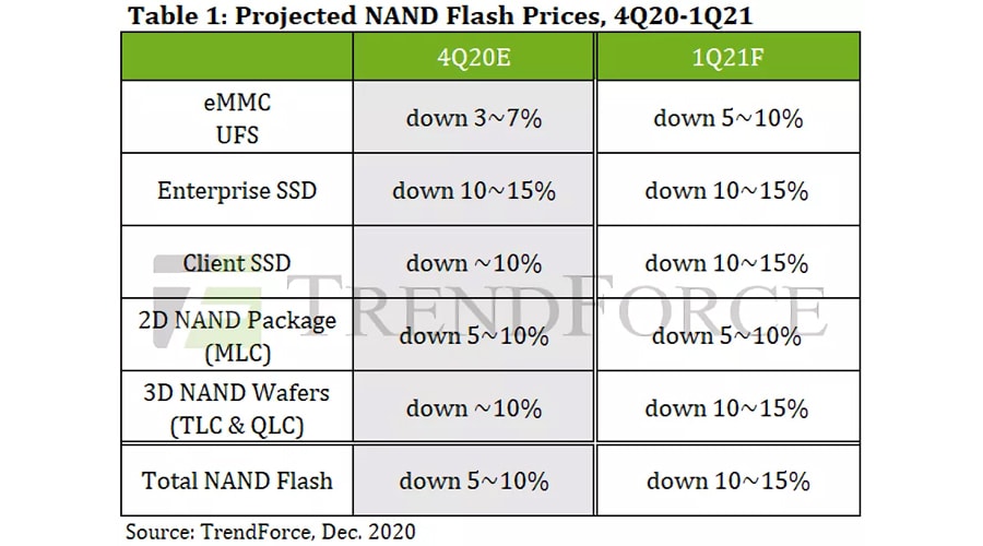 ในการคาดการณ์ล่าสุดของ TrendForce เป็นบริษัทวิจัยตลาดนั้นคาดว่าราคาเฉลี่ยของ NAND flash จะลดลง 10-15% ในไตรมาสแรกของปี 2021 ด้วยเหตุนี้เอง TrendForce จึงคาดว่า ราคา ของ SSD จะลดลงในเปอร์เซ็นต์ที่เท่ากันในอีก 3 เดือนข้างหน้า