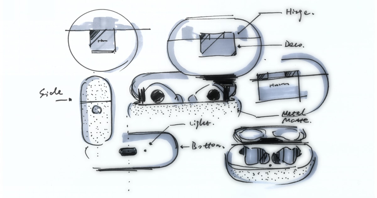 บรรยายภาพ: ตัวอย่างสเก็ทช์ร่างแรกของการออกแบบเคสชาร์จของ HUAWEI Free Buds Pro และการพัฒนาเคสชาร์จของ HUAWEI Free Buds Pro