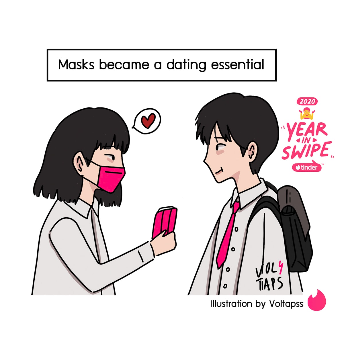 ในขณะที่โลกในชีวิตจริงโดนกดหยุดชั่วคราว สมาชิก Tinder จึงหันมาสร้างสรรค์และแบ่งปันวัฒนธรรมกันบน Tinderจนกลายเป็นสีสันใหม่ประจำปี 2020 กันเลยทีเดียว สมาชิกพากันพูดคุย นัดเจอ นัดเที่ยว แลกคลิป TikTok และแชร์ อิโมจิยักไหล่ กันในช่วงการเว้นระยะห่างทางสังคมอย่างคึกคัก นอกจากนี้เรายังได้เห็นโปรไฟล์ Tinder ที่นำเสนอแนวคิดของพวกเขาแบบสร้างสรรค์ และมีชีวิตชีวาอย่างไม่เคยมีมาก่อน แม้กระทั่งสถานการณ์อันย่ำแย่ก็ไม่ได้สะท้านต่อการแสดงตัวตนของเหล่าสมาชิกแม้แต่น้อย