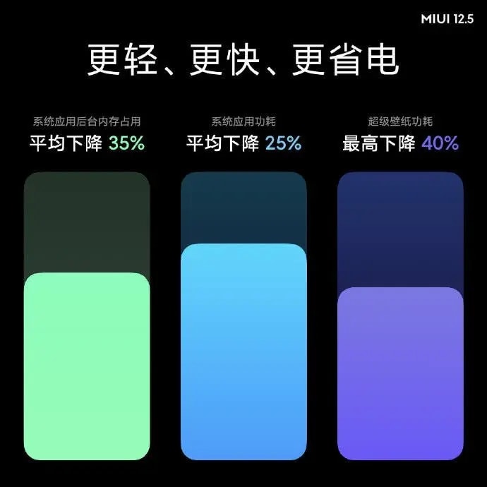 ในงานแถลงข่าวเปิดตัว Xiaomi Mi 11 บริษัทยังได้เปิดตัว MIUI 12.5 อย่างเป็นทางการด้วย มีการพัฒนาให้ตัวระบบปฏิบัติการนั้นเบากว่า เร็วกว่า และประหยัดขึ้นกว่าเดิม โดยระบบ UI ถูกเขียนใหม่ให้ใช้หน่วยความจำในส่วนของ core scene ลดลง 20% ระบบนี้ยังเพิ่มประสิทธิภาพให้ระบบแอปทีละแอปและลดการใช้หน่วยความจำในการรันแบ็คกราวน์โดยเฉลี่ยลงอีก 35% อีกทั้งยังลดการใช้พลังงานแอประบบลงอีกโดยเฉลี่ย 25%