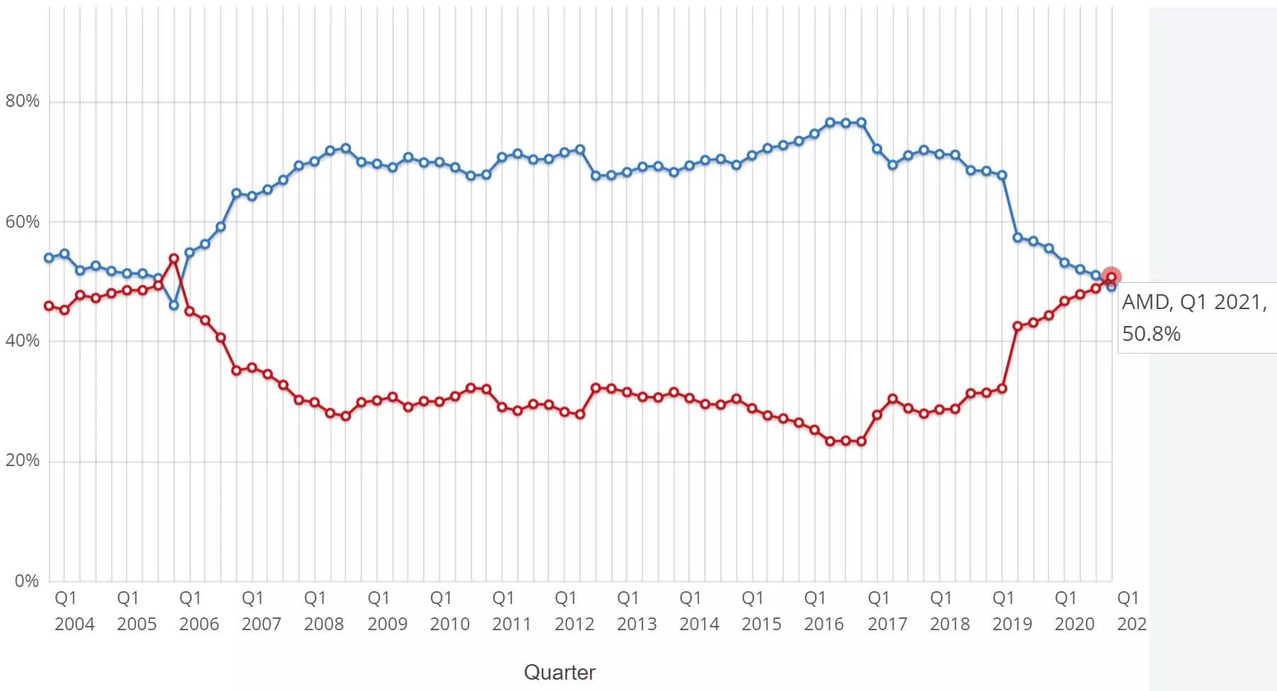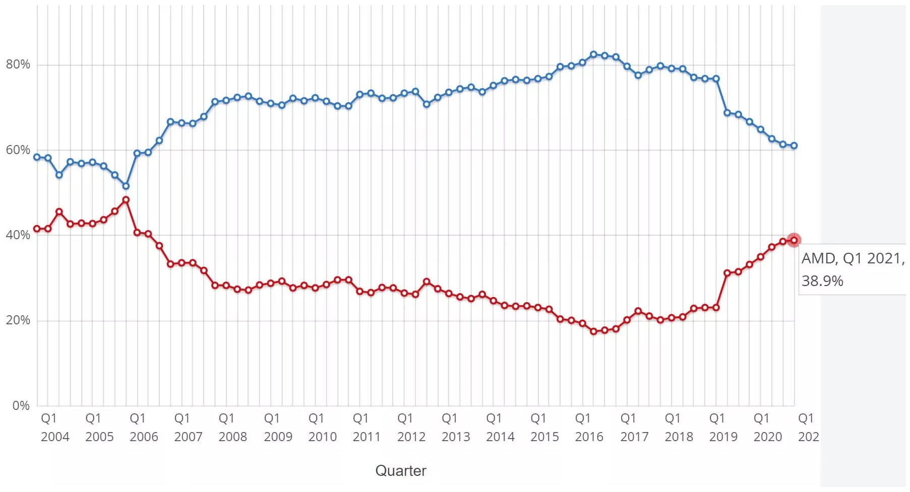 ครั้งสุดท้ายที่ส่วนแบ่งตลาด CPU เดสก์ท็อปของ AMD สามารถแซงหน้า Intel ได้นั้นคือช่วงไตรมาสที่ 1 ของปี 2006 โดยครองส่วนแบ่งตลาดได้ถึง 53.9%