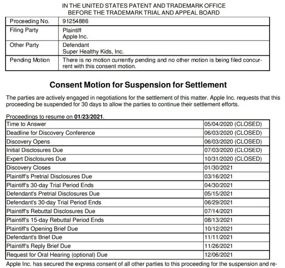 จากเอกสารที่ยื่นต่อสำนักงานสิทธิบัตรและเครื่องหมายการค้าแสดงให้เห็นว่า การดำเนินการที่เกี่ยวข้องกับ Apple และ Prepear จะต้องล่าช้าออกไป 30 วัน เนื่องจากทั้ง 2 ฝ่ายพยายามที่จะยุติเรื่องนี้ต่อศาล หากไม่มีข้อยุติก่อนวันที่ 23 มกราคม 2564 การดำเนินคดีจะต้องดำเนินต่อไปในวันนั้น นอกจากนี้ฝ่ายใดฝ่ายหนึ่งสามารถตัดสินใจที่จะไม่รอจนถึงวันดังกล่าวและดำเนินการต่อศาลได้ตลอดเวลา