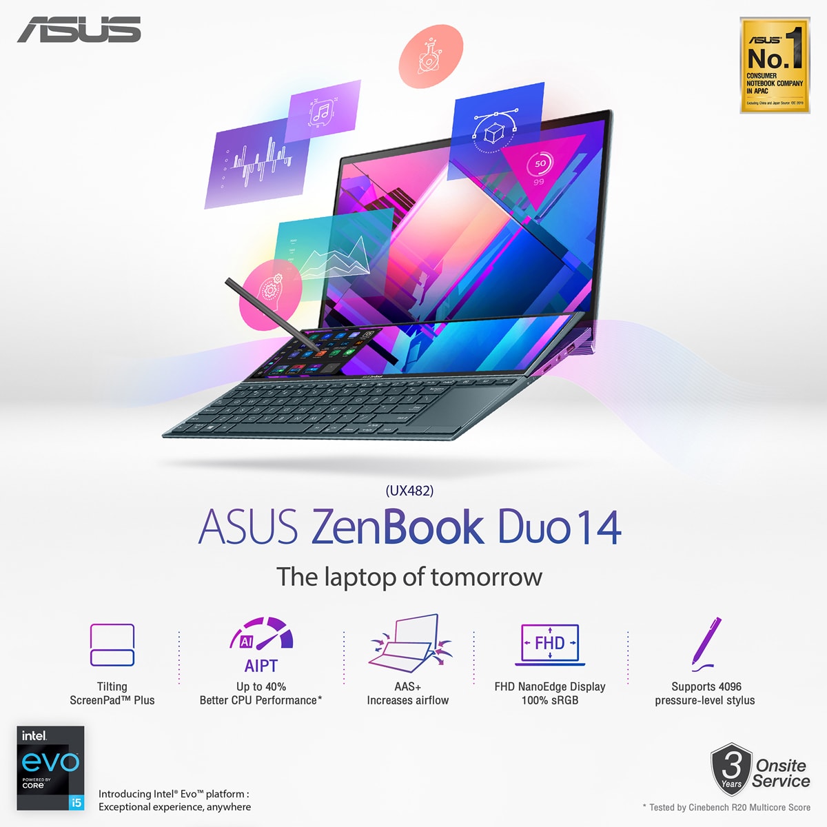 ZenBook Duo 14 UX482 ในปี 2021 นับเป็นรุ่นต่อยอดจาก ZenBook Duo UX481 โน้ตบุ๊กสองหน้าจอเจนเนอเรชั่นแรกที่ได้รับการตอบรับจากกลุ่มนักสร้างคอนเทนต์อย่างดีเยี่ยม โดยในครั้งนี้มาพร้อมโปรเซสเซอร์สูงสุด 11th Generation Intel Core i7 หน่วยความจำ (RAM) ขนาด 16 GB ที่ช่วยให้การทำงานระหว่างหน้าจอหลักและจอ ScreenPad Plus ขนาด 12.6 นิ้วเป็นไปได้อย่างราบรื่น โดยมาพร้อมหน่วยเก็บข้อมูลสูงสุด 1 TB PCIe 3.0 x4 SSD นอกจากนี้ ZenBook Duo ยังนำเสนอเทคโนโลยี ASUS Intelligent Performance Technology (AIPT) ที่ทำงานร่วมกับ 11th Gen Intel โปรเซสเซอร์ในการเร่งประสิทธิภาพการทำงานอย่างอัจฉริยะ สามารถเพิ่มประสิทธิภาพได้กว่า 40% เมื่อเทียบกับโน้ตบุ๊กทั่วไป ZenBook Duo 14 มีการ์ดจอให้ผู้ใช้ได้เลือกใช้งานอย่าง Iris Xe graphics และ NVIDIA GeForce MX450 ช่วยให้ผู้ใช้สามารถทำงานทางด้านภาพ และมัลติทาสก์ได้อย่างลื่นไหล เจาะกลุ่มนักออกแบบคอนเทนต์ระดับเริ่มต้นที่มองหาอุปกรณ์คู่ใจในการทำงาน