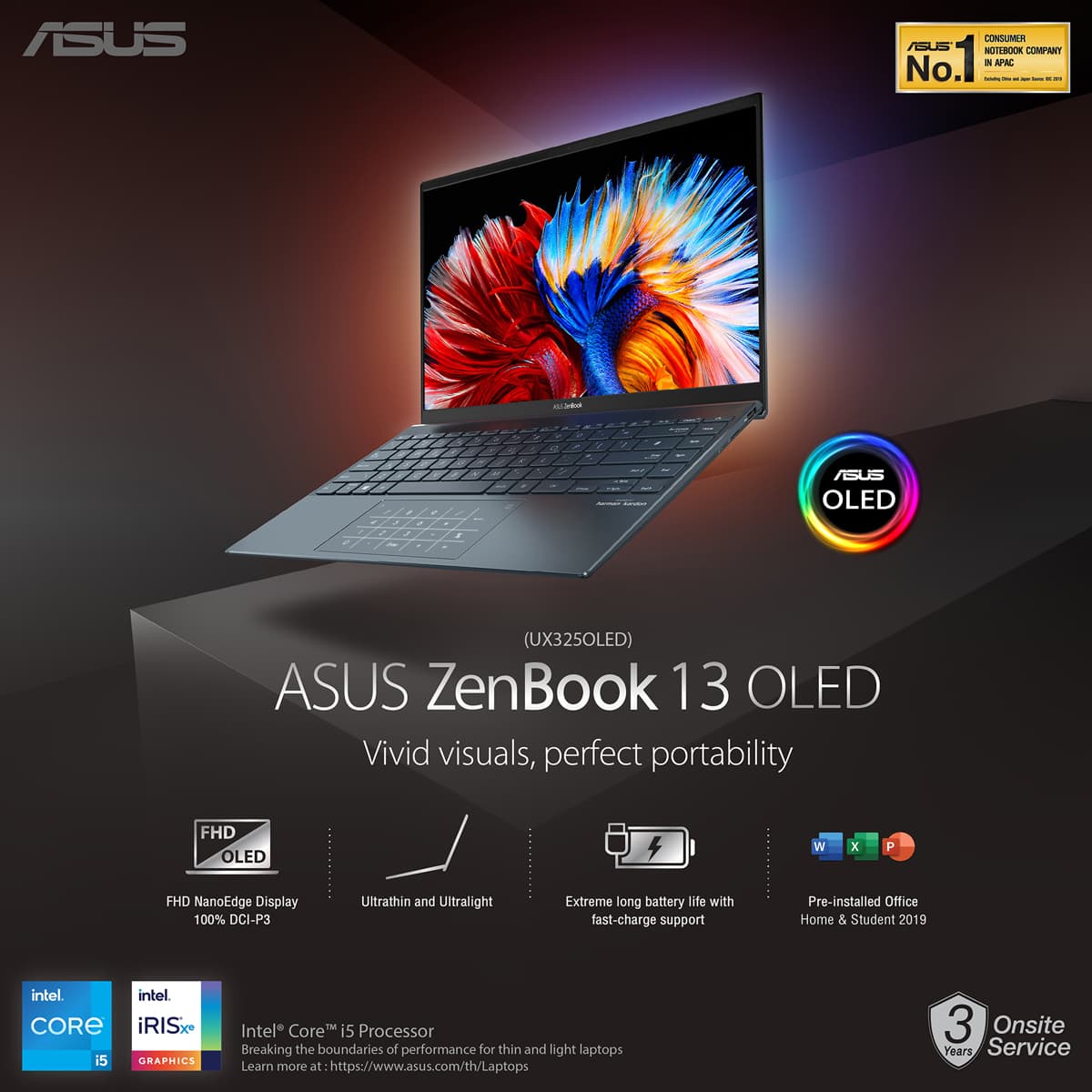 - UX325EA-KG001TS ราคา 28,900 บาท (i5-1135G7/LPDDR4X 8G [ON BD.]/512G PCIE G3/13” FHD OLED panel, 100% DCI-P3, Pantone Validated/Numpad/Sleeve/Microsoft Windows 10 Home/Microsoft Office Home & Student 2019)