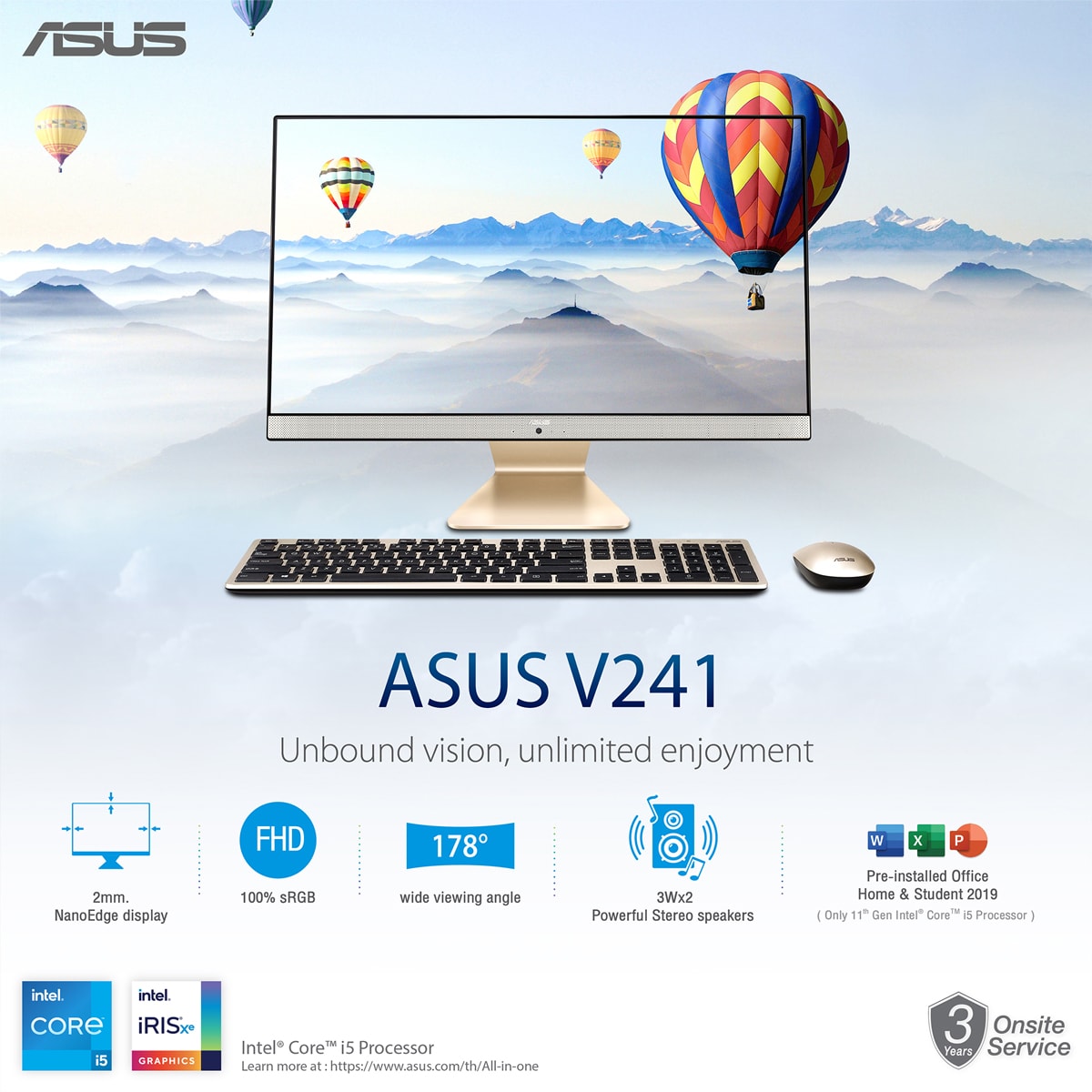 ASUS V241 รุ่นโปรเซสเซอร์ Core i5 ยังมาพร้อม Microsoft Windows 10 และ Pre-installed Microsoft Office Home & Student 2019 ติดตั้งพร้อมใช้งาน ASUS V241 พร้อมวางจำหน่ายตั้งแต่ 25 มกราคม 2564 เป็นต้นไปในราคาเริ่มต้น 17,990 บาท พร้อมการรับประกัน on-site service 3 ปีเต็ม ทุกรุ่น รายละเอียดเพิ่มเติมดังนี้