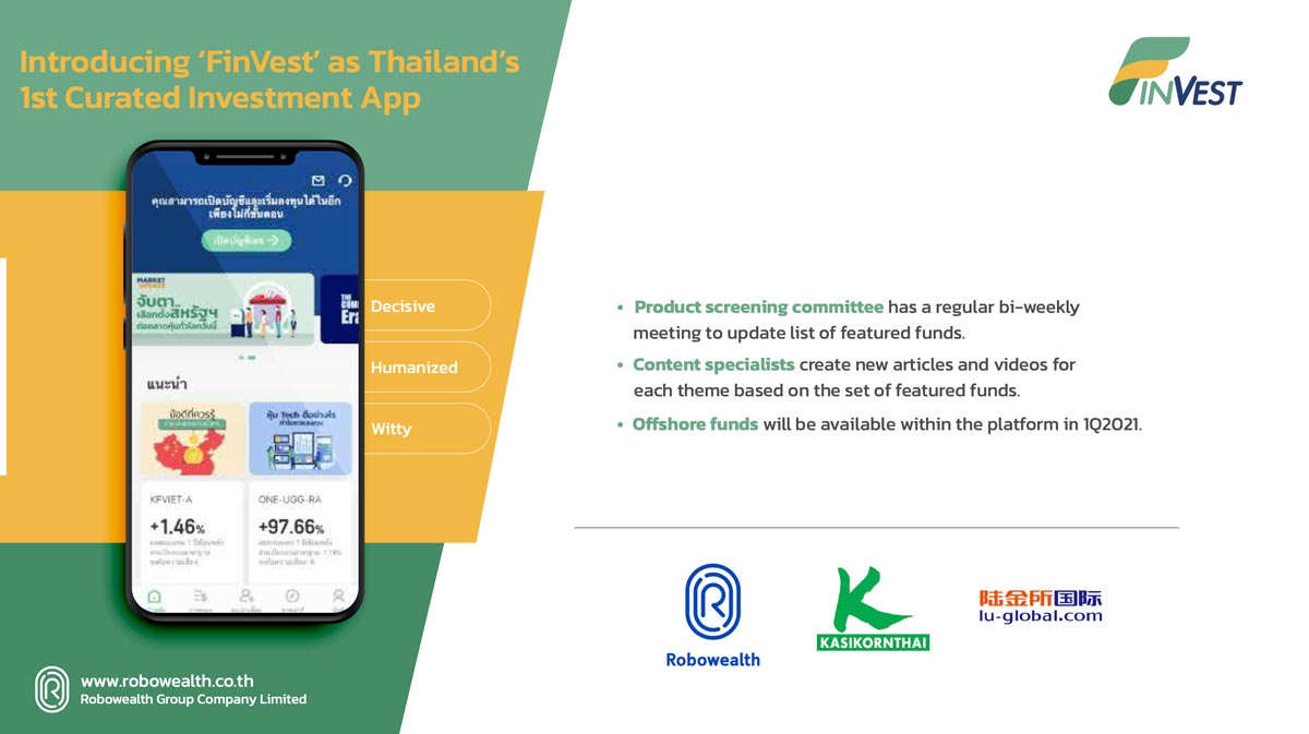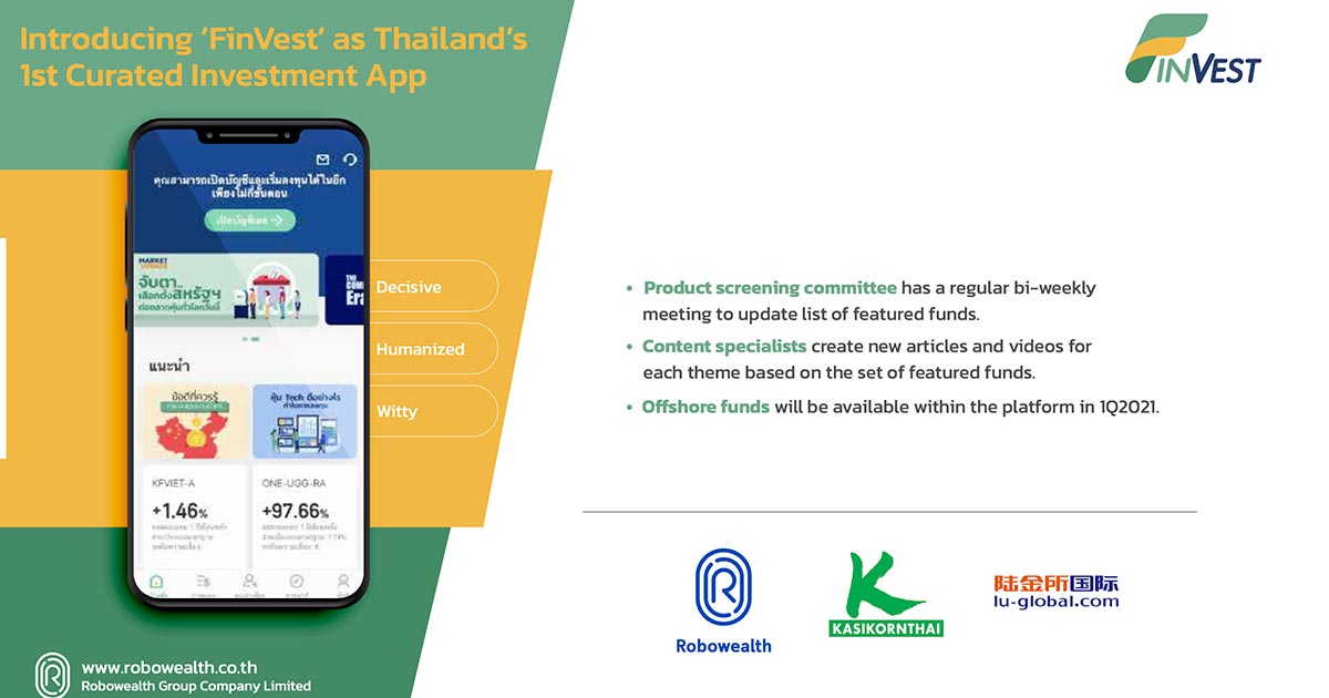 โดยที่ Robowealth ได้เพิ่มเติมบริการ odini BLACK เข้าไปในแอปพลิเคชันเดิม เพื่อตอบสนองความต้องการที่เพิ่มขึ้นของลูกค้ากลุ่ม Mass Affluent และแอปพลิเคชัน FinVest ซึ่งเพิ่งเปิดตัวไปในช่วงปลายปี 2563 เพื่อให้บริการคัดเลือกกองทุนรวมที่น่าสนใจ ในรูปแบบ Thematic Investment เน้นการให้ข้อมูลที่มีเนื้อหาเข้าใจง่าย คมชัด และ “ชี้เป้า” การลงทุนอย่างเป็นกลาง ผ่านผู้จัดการกองทุนและนักวิเคราะห์การลงทุนมืออาชีพ ภายใต้คณะกรรมการคัดเลือกผลิตภัณฑ์การลงทุน ที่ช่วยกันคัดเลือกกองทุนจาก บลจ. ชั้นนำทั้งในประเทศไทยและต่างประเทศ โดย FinVest ถือเป็นความร่วมมือของ Robowealth กับธนาคารกสิกรไทยและ Lu International บริษัทฟินเทคระดับโลก