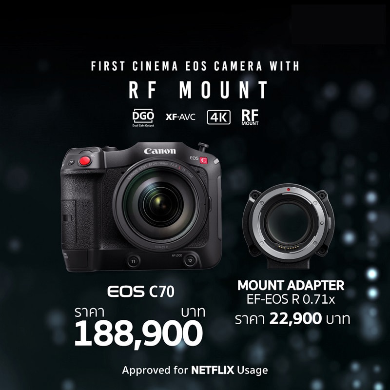 Canon EOS C70 ราคา 188,900 บาท และเมาท์อะแดปเตอร์ EF-EOS R 0.71x ราคา 22,900 บาท วางจำหน่ายตั้งแต่ 21 มกราคมนี้