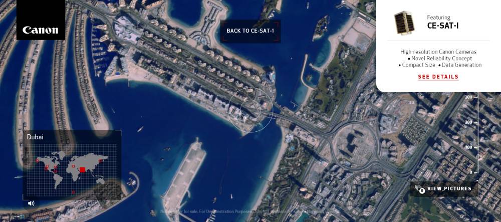 Canon เปิดตัว Microsatellite ขนาดเท่าถังไวน์ไปเมื่อเดือนมิถุนายน 2017 โดยมีกล้อง EOS 5D Mark III ที่เป็นกล้องโทรทรรศน์ขนาด 3720 มม. แบบ Cassegrain (กระจก) ติดตั้งไว้ มีวงโคจรอยู่ที่ 600 กิโลเมตร (375 ไมล์) ให้ความละเอียดพื้นที่ 36 นิ้วภายในกรอบ 3×2 ไมล์ มี PowerShot S110 เพื่อให้ได้ภาพในมุมที่กว้างขึ้น