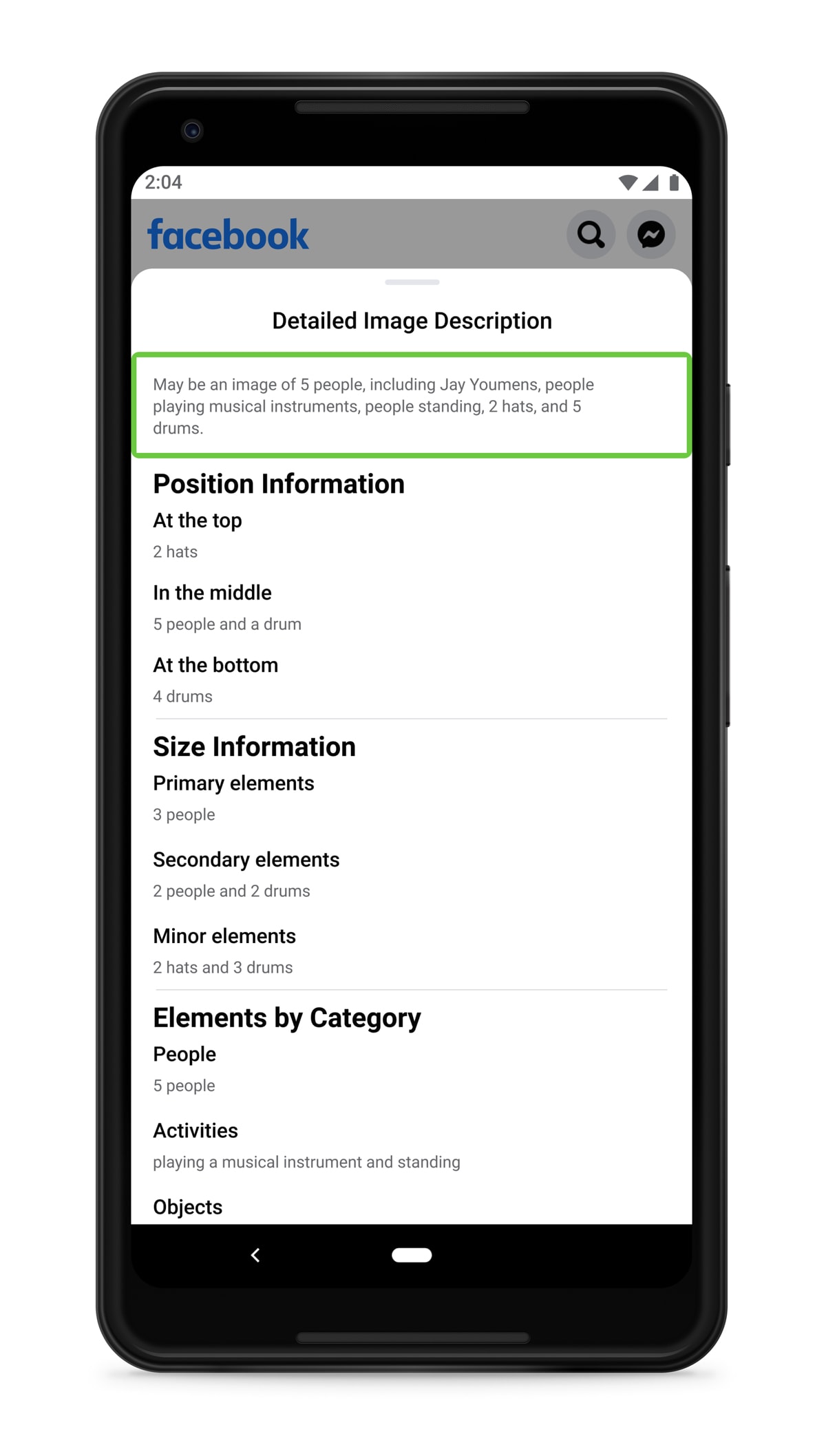 Facebook เป็นรายแรกในอุตสาหกรรมที่นำฟีเจอร์ AAT มาใช้ให้ข้อมูลที่มีรายละเอียด เช่น การบอกตำแหน่งของวัตถุในรูป (ด้านบน ตรงกลาง ด้านล่าง หรือ ด้านซ้าย ขวา ตรงกลาง) และบอกขนาดเทียบเคียงกับสิ่งอื่นที่อยู่รอบๆ โดยปัจจุบัน ฟีเจอร์ AAT สามารถระบุได้ว่ามีคน 2 คนอยู่ตรงกลางของรูป และอีก 3 คนอยู่ที่ด้านหลัง ผู้ใช้งานสามารถเข้าถึงตัวเลือกในการเพิ่มคำบรรยายที่บอกรายละเอียดมากขึ้นนี้โดยการกดค้างที่รูปสำหรับระบบปฏิบัติการแอนดรอยด์ หรือกด 3 จุด (…) แล้วไปที่ “แก้ไขข้อความกำกับภาพ” สำหรับผู้ที่ใช้ระบบปฎิบัติการ iOS