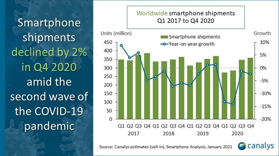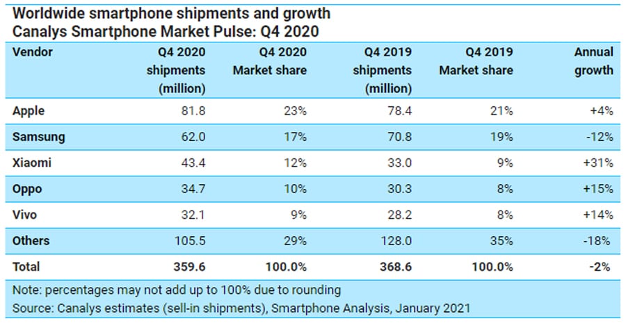 ข้อมูลจาก Canalys ช่วงไตรมาสที่ 4 ปี 2020 การจัดส่งสมาร์ทโฟนทั่วโลกนั้นสูงถึง 359.6 ล้านเครื่อง ลดลง 2% เมื่อเทียบรายปี โดยที่ Apple จัดส่ง iPhone มากที่สุดเท่าที่เคยมีมา ภายในไตรมาสเดียวถึง 81.8 ล้านเครื่อง เพิ่มขึ้น 4% เมื่อเทียบกับปีที่ผ่านมา Samsung ตามมาเป็นอันดับสอง โดยมียอดจัดส่ง 62 ล้านเครื่อง ลดลง 12% เมื่อเทียบกับปีที่ผ่านมา
