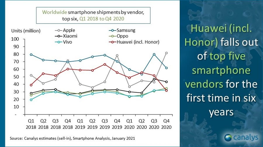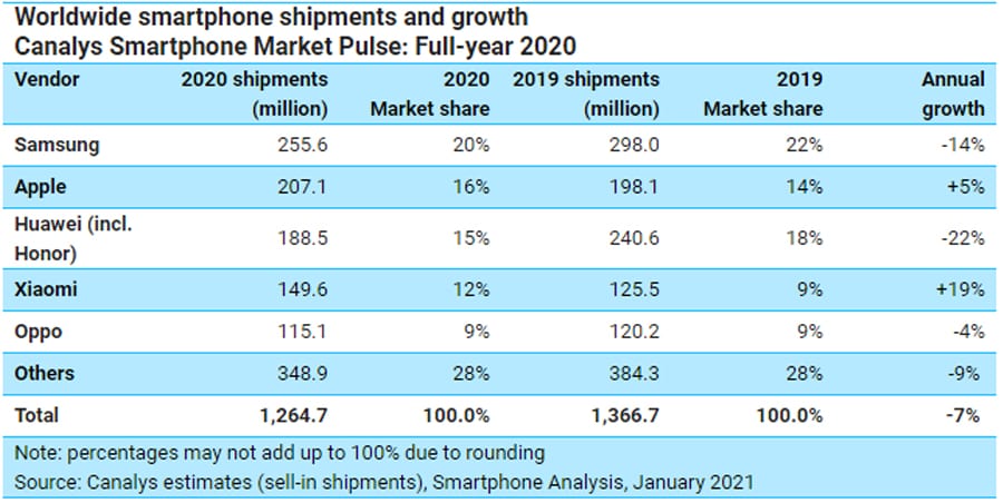 ตลอดทั้งปี 2020 Samsung ยังคงรักษาตำแหน่งผู้นำของส่วนแบ่งตลาดทั่วโลกได้ที่ 20% Apple ตามมาเป็นอันดับสอง และ Huawei รวมกับ Honor ตามมาเป็นอันดับสาม
