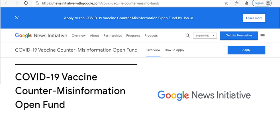 Google News Initiative (GNI) ประกาศจัดตั้งกองทุนต้านข่าวลวงเกี่ยวกับวัคซีนโควิด-19 มูลค่า 3 ล้านดอลลาร์สหรัฐ ที่มีชื่อว่า COVID-19 Vaccine Counter-Misinformation Open Fund