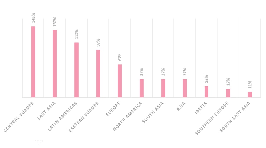 ยุโรปตอนกลางเป็นภูมิภาคที่ถูกโจมตีหน่วยงานด้านสุขภาพสูงสุด มีการโจมตีเพิ่มขึ้นถึง 145% ในเดือนพฤศจิกายน ตามมาด้วยเอเชียตะวันออกที่เพิ่มขึ้น 137% ละตินอเมริกาเพิ่มขึ้น 112% ส่วนทางฝั่งอเมริกาเหนือ เพิ่มขึ้น 67%