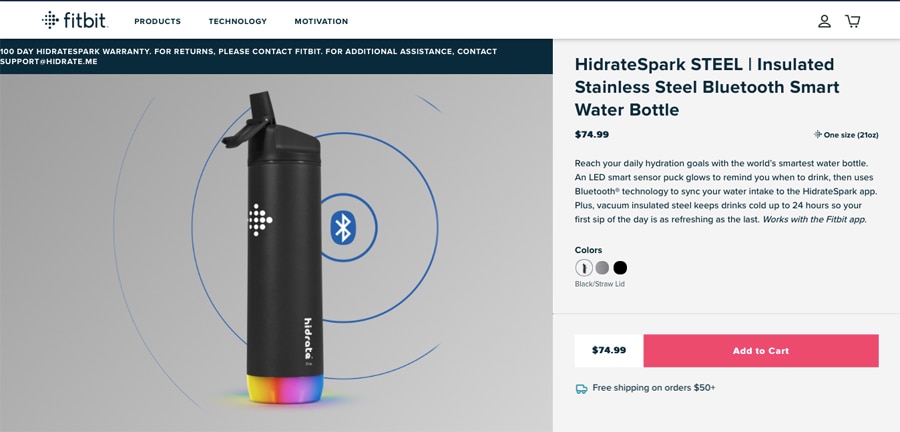 HidrateSpark STEEL Smart Water Bottle เป็นอุปกรณ์ที่จะเข้ามาช่วยผู้ใช้ให้มีสุขภาพที่ดีขึ้น โดยมีระบบที่ทำความเข้าใจกับความต้องการการดื่มน้ำในแต่ละวันของผู้ใช้ด้วยข้อมูลจากอุปกรณ์ของ Fitbit