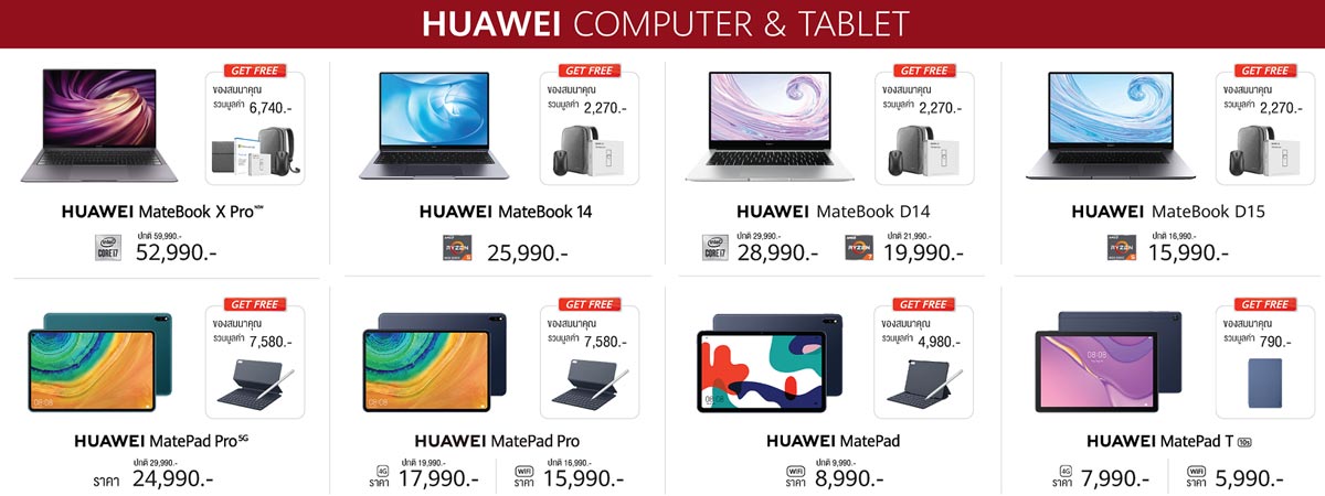 - HUAWEI MatePad Pro (5G, 4G, WiFi) รับฟรี HUAWEI M-Pencil และ HUAWEI Smart Keyboard มูลค่ารวม 7,580 บาท