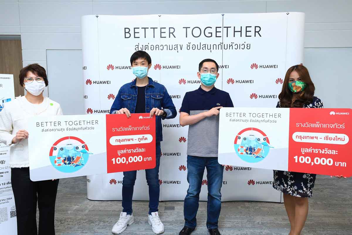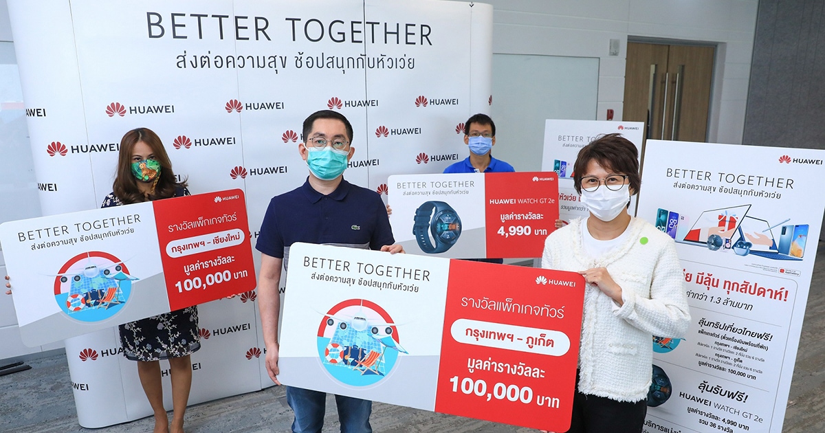 โดยในแคมเปญ “HUAWEI Better Together 2020” เรียกได้ว่าแจกรางวัลข้ามปีกันตั้งแต่วันที่ 2 ธันวาคม 2563 จนถึงวันที่ 6 มกราคม 2564 โดยรางวัลที่ 1 เป็นสมาร์ทวอทช์สุดฮิตอย่าง HUAWEI Watch GT 2e สีดำ มูลค่า 4,990 บาท จำนวนทั้งหมด 36 เครื่อง ตามมาด้วยรางวัลที่ 2 เป็นแพ็คเกจท่องเที่ยวกรุงเทพฯ – เชียงใหม่ และรางวัลที่ 3 เป็นแพ็คเกจท่องเที่ยวกรุงเทพฯ – ภูเก็ต เดินทางโดยสายการบินบางกอกแอร์เวย์ส รางวัลละ 2 ที่นั่ง มูลค่า 100,000 บาท จำนวนเส้นทางละ 6 รางวัล รวม 12 รางวัล โดยในทริปนี้นอกจากจะบินฟรีกับบางกอกแอร์เวย์สแล้ว หัวเว่ยยังจัดที่พักพร้อมอาหารเช้า 3 วัน 2 คืนให้ด้วย รวมมูลค่าทั้งแคมเปญกว่า 1.3 ล้านบาท จัดใหญ่จัดเต็มต้อนรับปีวัวทองแบบไม่กั๊ก