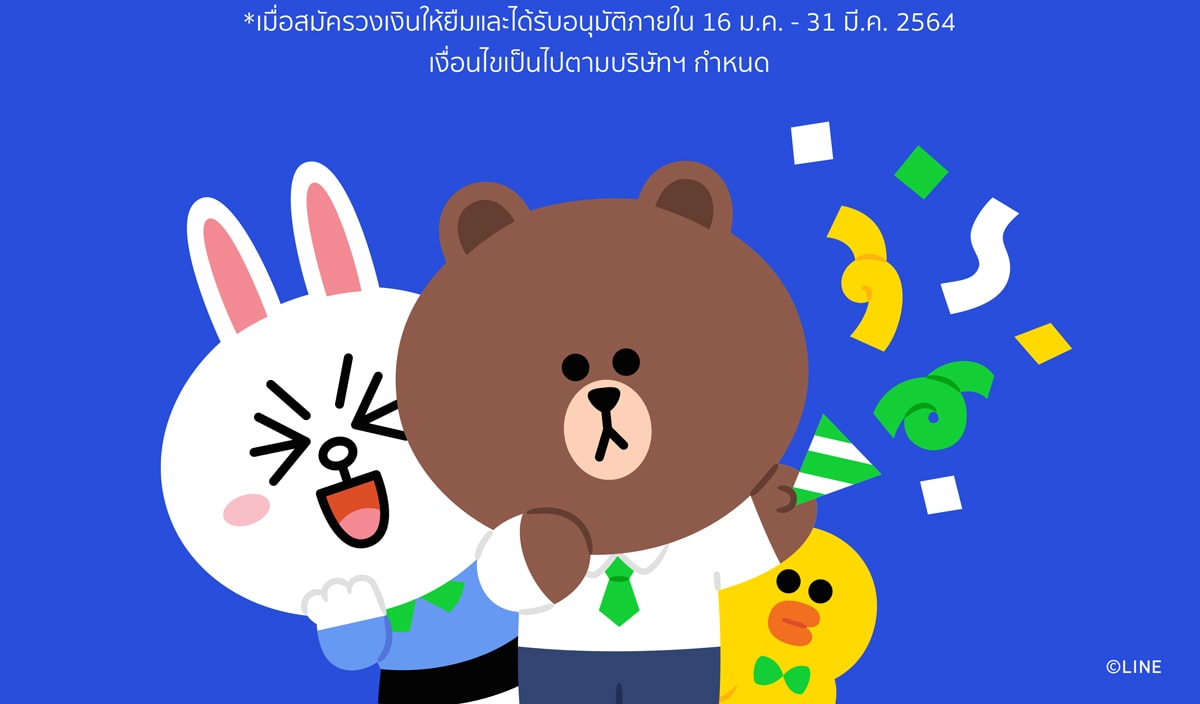 LINE BK โปรโมชั่น พิเศษ สำหรับลูกค้าใหม่ เมื่อสมัครวงเงินให้ยืม และได้รับอนุมัติภายในวันที่ 16 มกราคม –31 มีนาคม 2564 รับทันทีอัตราดอกเบี้ยพิเศษ 9.99% สู้ COVID-19 ต่อปี นาน 2 เดือน ไม่มีรายได้ประจำก็สามารถยืมได้ ทั้งอนุมัติไว