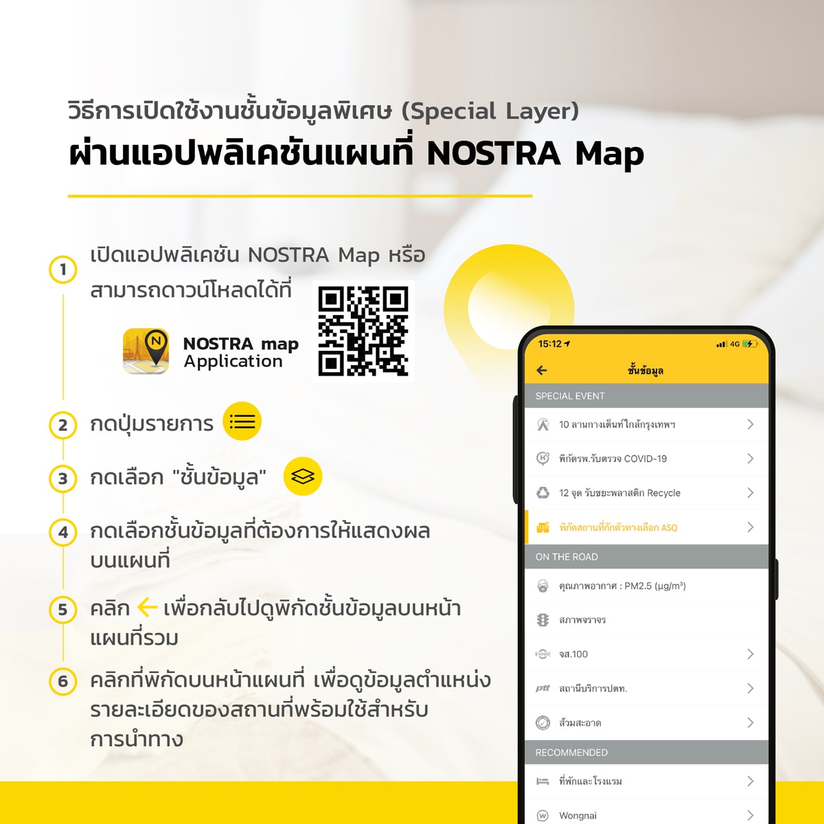 ทั้งนี้ นอกจาก NOSTRA Map จะใช้เพื่อค้นหาเส้นทางและนำทางแล้ว ยังสามารถเลือกการเดินทางโดย มอเตอร์ไซค์ ระบบขนส่งสาธารณะไว้ครบถ้วนทั้งรถประจำทาง รถไฟ รถไฟฟ้า BTS MRT ฯลฯ ดาวน์โหลดเพื่อทดลองใช้บริการค้นหา-นำทาง รวมถึงตรวจเช็คคุณภาพอากาศค่าฝุ่น PM 2.5 ดาวน์โหลดใช้งานฟรีได้ที่ https://map.nostramap.com/mobile
