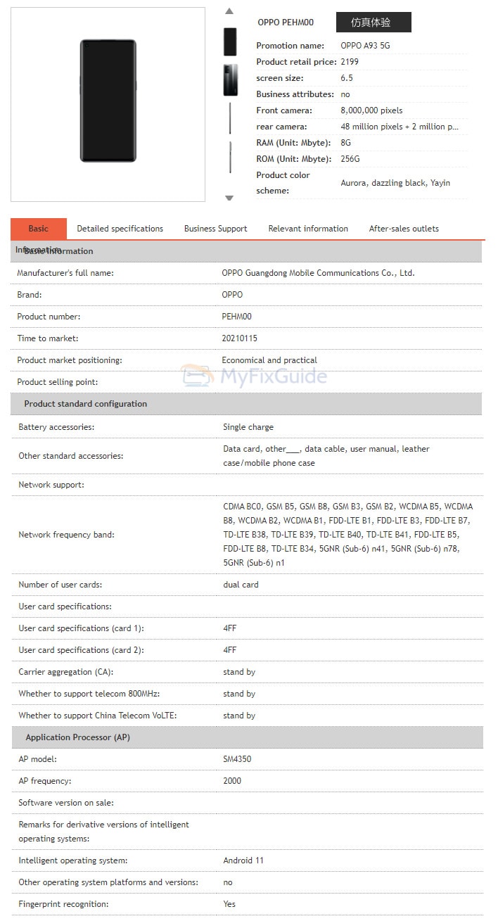 มีการพบข้อมูลสมาร์ทโฟนรุ่นใหม่จาก OPPO บนเว็บไซต์ China Telecom มีหมายเลขรุ่นว่า OPPO PEHM00 โดยใช้ชื่อทางการตลาดว่า OPPO A93 5G และตัวสมาร์ทโฟนมีการใช้ชิปเซ็ต Snapdragon 480 ก่อนหน้านี้โมเดลนี้ยังได้รับการรับรองจาก 3C อีกด้วย โดย ราคา ขายที่จีนอยู่ที่ 2,199 หยวน