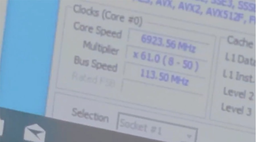 จากคลิปสั้นๆ ที่โพสต์บนทวิตเตอร์โดย VWorld (@PttpcWorld) นักโอเวอร์คล็อกสามารถโอเวอร์คล็อกโปรเซสเซอร์ Intel Rocket Lake-S แบบ octa-core โดยทดสอบกับเมนบอร์ด Z590 ซีรี่ส์รุ่นใหม่ล่าสุด ที่ความเร็ว 6923.56 MHz โดยใช้ไนโตรเจนเหลว ใช้ความเร็วบัส113.50 MHz จับคู่กับตัวคูณ 61x