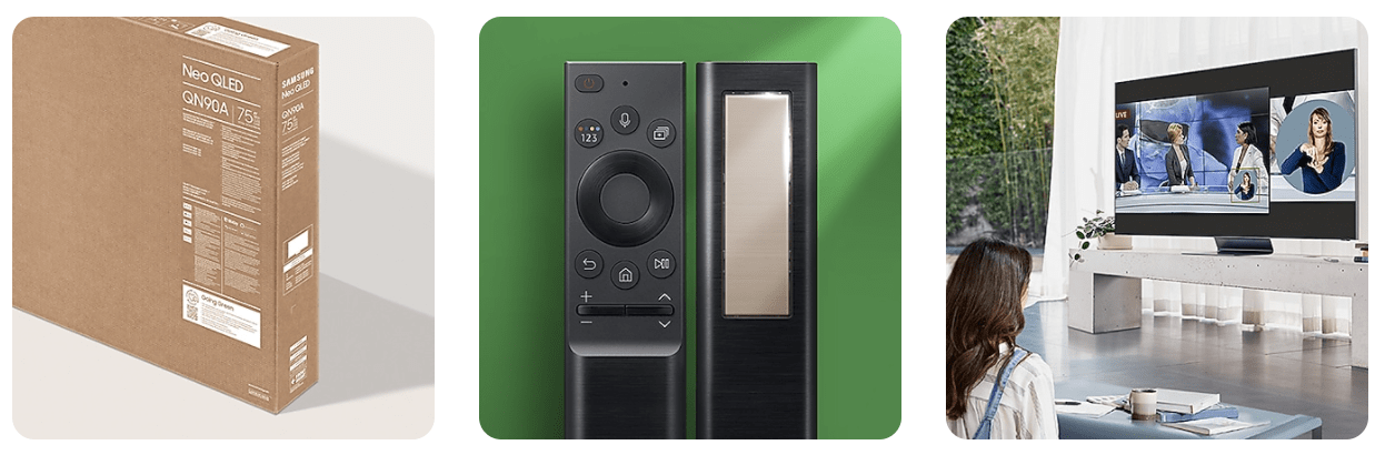- รีโมทควบคุมโซลาร์เซลล์ – ในปี 2564 ซัมซุงทีวีจะมาพร้อมกับรีโมทควบคุมโซลาร์เซลล์ ที่สามารถชาร์จพลังงานได้จากแสงภายในตัวอาคาร แสงภายนอก หรือ USB ซึ่งนับเป็นนวัตกรรมรุ่นบุกเบิกจากซัมซุง ที่จะช่วยลดขยะจากถ่านขนาด AAA ได้ถึง 99 ล้านก้อน ภายใน 7 ปี ยิ่งไปกว่านั้นซัมซุงยังได้คิดค้นกระบวนการผลิตที่นำพลาสติกจากขวดน้ำกลับมาใช้ในการผลิตรีโมทควบคุมได้ถึง 24 เปอร์เซ็นต์