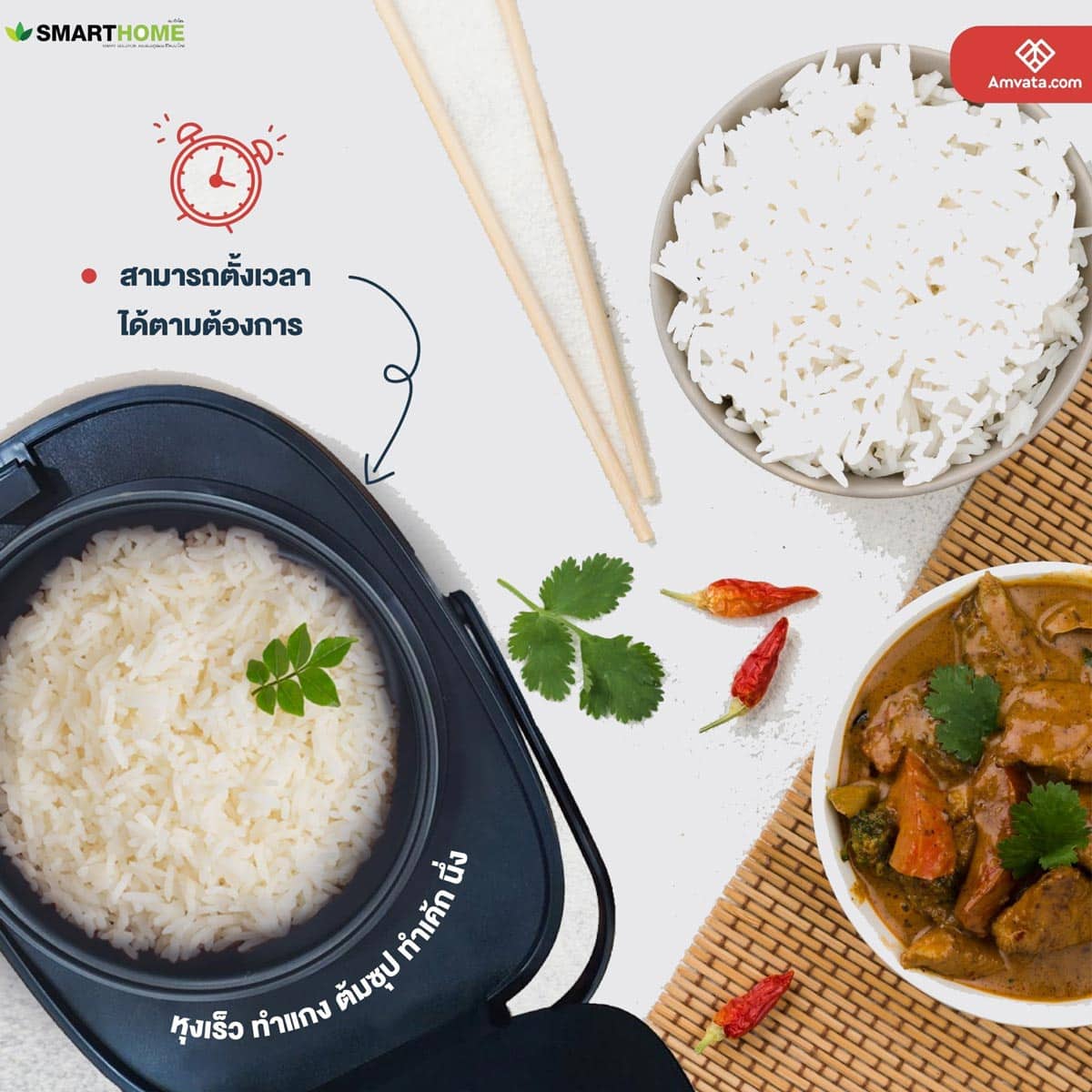 ซึ่งโดยปกติการหุงข้าวทั่วไปนั้น น้ำจะเข้าไปที่ตัวข้าว ทำให้มีปริมาณน้ำตาลในข้าวถึง 63.6% และปริมาณแป้งอยู่ที่ 65% แต่การหุงข้าวด้วยหม้อหุงข้าวลดน้ำตาลนี้ จะทำให้ได้ข้าวไร้น้ำตาล (มีน้ำตาล 0%) และสามารถลดปริมาณแป้ง (CARB) เหลือเพียง 27.4% โดยใช้เวลาในการหุง 50 นาที การหุงข้าวลักษณะนี้ นอกจากรสชาติที่ดีขึ้นแล้ว เนื้อข้าวยังจะฟูนุ่มกว่าการหุงข้าวด้วยหม้อหุงข้าวแบบธรรมดา นอกจากนี้ SMARTHOME หม้อหุงข้าวลดน้ำตาล ยังมีฟังก์ชั่นการใช้งานอื่นๆ อีกกว่า 16 ฟังก์ชั่น รองรับการทำอาหารหลากหลายเมนูทั้งในรูปแบบต้ม แกง นึ่ง อีกทั้งยังสามารถตั้งเวลาการทำงาน ได้อย่างอิสระตามความต้องการของผู้ใช้ได้อีกด้วย โดยทั้ง 3 รุ่น จัดจำหน่ายในราคา 1,990 บาท มีให้เลือก 4 สี ได้แก่ สีดำ สีน้ำตาลอัลมอนด์ สีแดง และสีขาว”