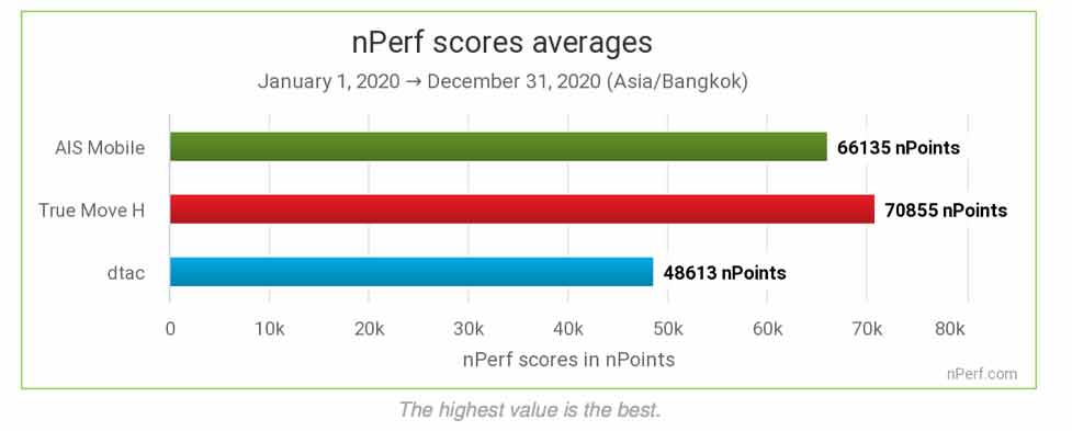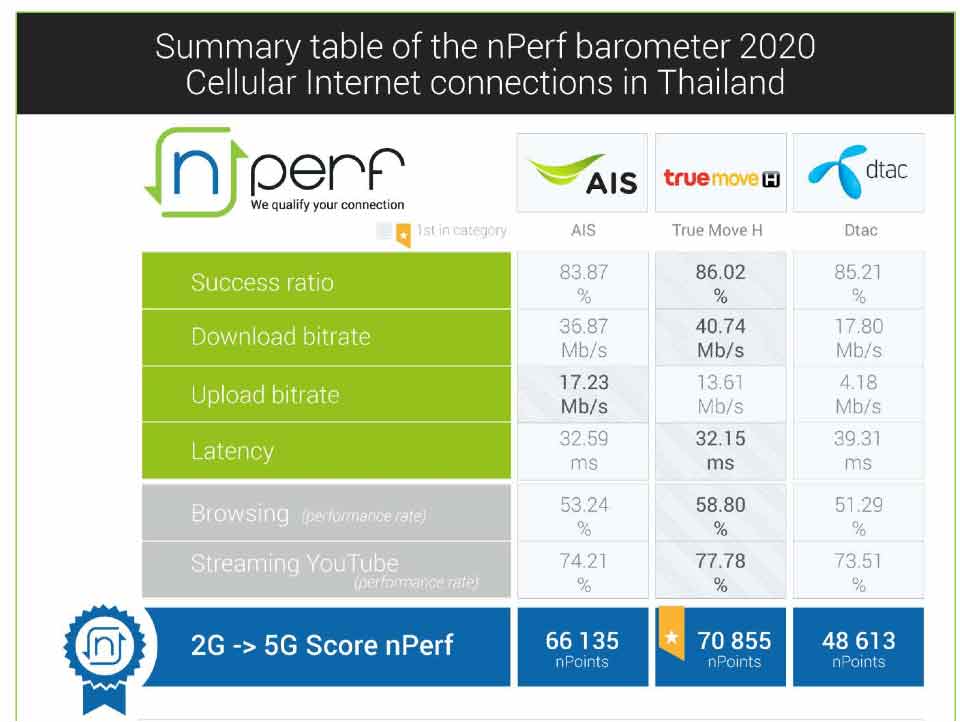 โดยผลการสำรวจได้รวบรวมจากผู้ใช้ งานแอป nPerf ทั้งหมดในช่วงระหว่างวันที่ 1 มกราคม ถึง 31 ธันวาคม 2563 จำนวน 2,902,011 ครั้ง ซึ่งทรูมูฟ เอชได้คะแนนรวมสูงสุด 70,855 คะแนน และมีคะแนนนำใน 4 หมวดการทดสอบที่สำคัญๆ ทั้งความเร็วดาวน์โหลดที่ดีที่สุด (Best Download Speed) 40.7 Mb/s ค่าความหน่วงต่ำหรือ Latency ดีที่สุด (Best Latency) 32.1 ms การเบราว์ซิงหรือคุณภาพในการเปิดเว็บที่ดีที่สุด (Best Browsing Performance) ด้วยค่าเฉลี่ยสูงสุดถึง 58.8 % โดยพิจารณาจากคุณภาพการเปิด 5 เว็บไซต์ที่ผู้ใช้งานอินเทอร์เน็ตชาวไทยใช้บ่อยที่สุด และการสตรีมมิ่งหรือคุณภาพการสตรีมมิ่งวิดีโอที่ดีที่สุด (Best Streaming Performance) ด้วยค่าเฉลี่ยสูงสุดถึง 77.7%