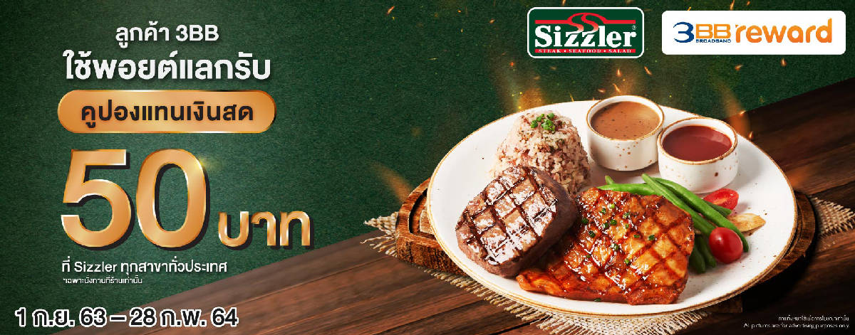 สุขเต็มคำ กับเมนูอาหารจานหลักและสลัดบาร์สุดคุ้ม ลูกค้า 3BB เพียงใช้คะแนน 50 พอยต์ แลกรับคูปองแทนเงินสดเป็นส่วนลดค่าอาหารมูลค่า 50 บาท ที่ร้านซิซซ์เล่อร์ ทุกสาขา (ไม่สามารถใช้กับบริการส่งเดลิเวอรี่ได้) กดรับสิทธิ์ได้ที่ 3BB Member Application สิทธิพิเศษมีจำนวนจำกัด ถึง 28 กุมภาพันธ์ 2564