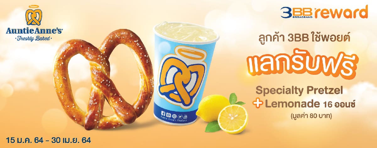 จะทานเป็นมื้อหลัก หรือรับประทานเล่นเป็นของว่าง ก็อร่อยฟินเต็มคำได้ทุกมื้อ สิทธิพิเศษเฉพาะลูกค้า 3BB เพียงใช้ 150 พอยต์ รับฟรีไปเลยเซ็ตอาหารทานเล่น ประกอบด้วย Specialty Pretzel 1 ชิ้น และ Lemonade 16 ออนซ์ 1 แก้ว (มูลค่า 80 บาท) ที่ร้านอานตี้ แอนส์ ทุกสาขาที่ร่วมรายการ กดรับสิทธิ์ได้ที่ 3BB Member Application สิทธิพิเศษมีจำนวนจำกัด ถึง 30 เมษายน 2564