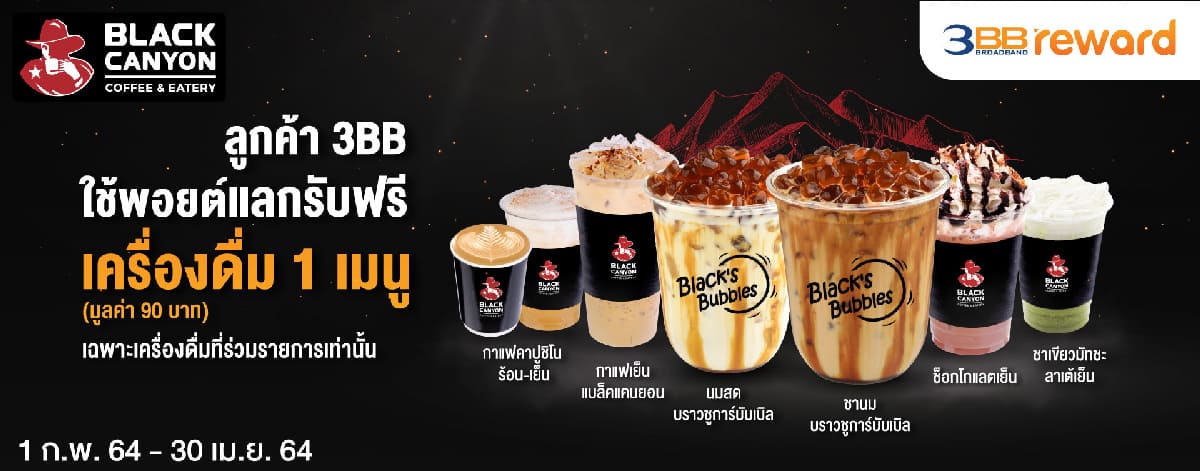 สดชื่นคลายร้อนกับเมนูเครื่องดื่มเย็นของ BLACK CANYON เพียงใช้คะแนน 170 พอยต์ เลือกรับฟรีทันทีเครื่องดื่ม 1 เมนู (มูลค่าสูงสุด 90 บาท) จากเมนูกาแฟเย็นแบล็คแคนยอน, กาแฟคาปูชิโน ร้อน-เย็น, ช็อกโกแลตเย็น, ชาเขียวมัทชะลาเต้เย็น, ชานมบราวชูการ์บับเบิล และนมสดบราวชูการ์บับเบิล ที่ร้าน BLACK CANYON ทุกสาขา (ยกเว้น สาขาในงาน Event เมืองทองธานี) ตั้งแต่วันนี้ – ถึง 30 เมษายน 2564 กดรับสิทธิ์ได้ที่ 3BB Member Application