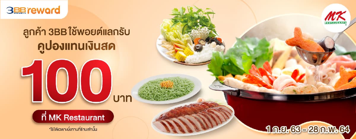 ลูกค้า 3BB อิ่ม อร่อยกับสุกี้รสเลิศ น้ำจิ้มรสเด็ด และอีกหลากหลายเมนูทั้งขนมจีบ ซาลาเปา อาหารจานเดียว ข้าวและบะหมี่หน้าต่างๆ เพียงใช้คะแนน 100 พอยต์ แลกรับคูปองแทนเงินสดมูลค่า 100 บาท สำหรับชำระค่าอาหารที่ร้านอาหาร MK ทุกสาขา (เฉพาะนั่งทานที่ร้านเท่านั้น ไม่สามารถใช้กับบริการส่งเดลิเวอรี่ได้) กดรับสิทธิ์ได้ที่ 3BB Member Application สิทธิพิเศษมีจำนวนจำกัด ถึง 28 กุมภาพันธ์ 2564