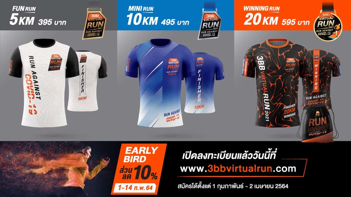 - ผู้สนใจร่วมเป็นส่วนหนึ่งในโครงการ สมัครได้ที่ www.3bbvirtualrun.com วันที่ 1 กุมภาพันธ์ – 2 เมษายน 2564