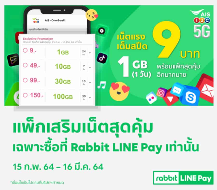 AIS มอบความพิเศษ จัด แพ็กเสริม ในราคาสุดพิเศษ เน็ตแบบวิ่งเต็มสปีด 100GB แค่ 150 บาท และยังมีอีกหลายราคาที่คุ้มมาก เฉพาะซื้อที่ Rabbit LINE Pay เท่านั้น โปรโมชั่น เริ่มตั้งแต่ 15 กุมภาพันธ์ – 16 มีนาคม นี้เท่านั้น