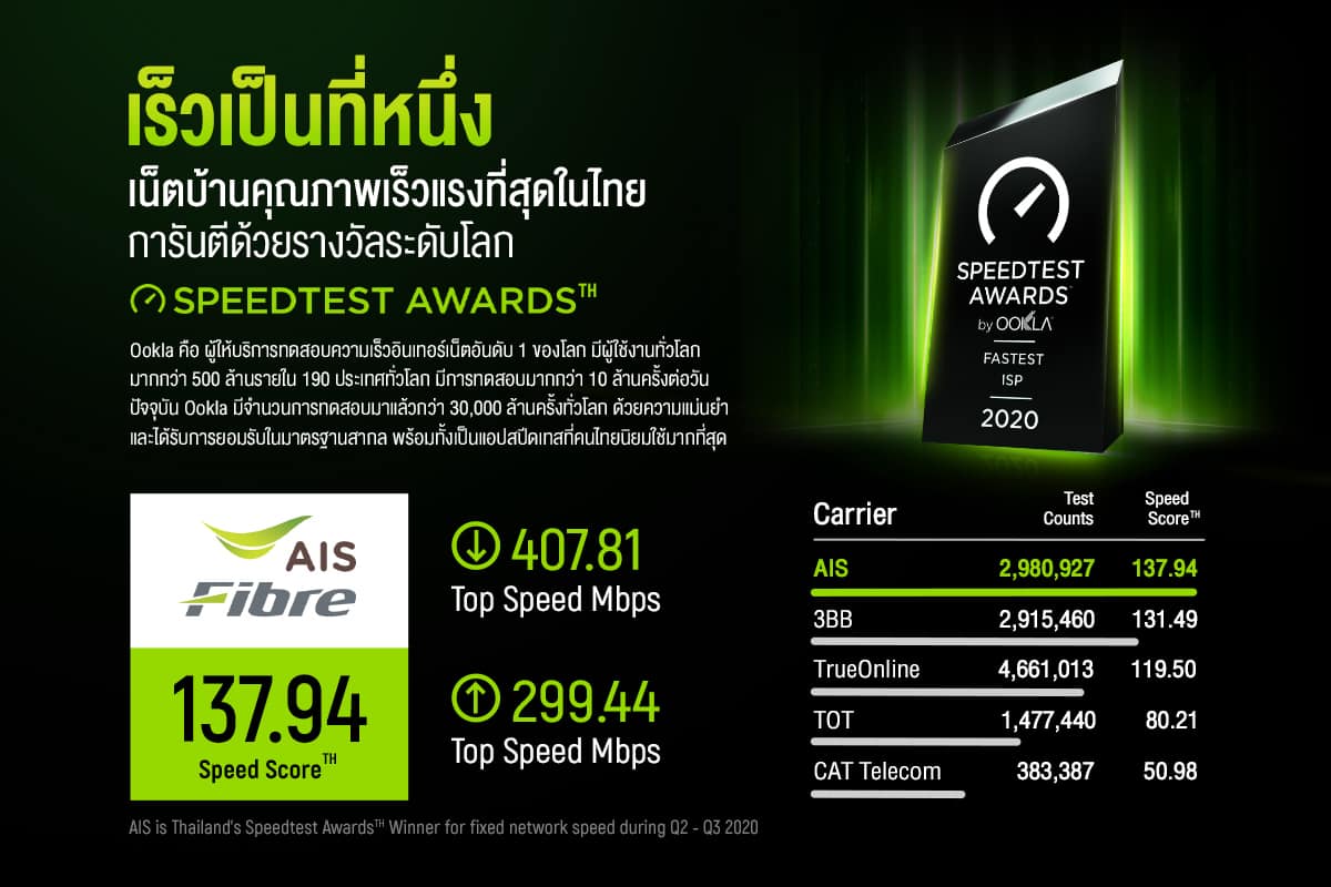 พร้อมทั้งเป็นแอปสปีดเทสที่คนไทยนิยมใช้มากที่สุดประกาศให้ AIS Fibre ได้รับรางวัล เครือข่ายอินเทอร์เน็ตบ้านที่เร็วที่สุด ในประเทศไทย -Thailand’s Fastest ISP 2 ปีซ้อน (ปี 2019-2020) โดยผลล่าสุด ในปี 2020 AIS Fibre ยังคงเป็นอันดับหนึ่ง ด้วยคะแนนความเร็วในการให้บริการอินเทอร์เน็ต Speed Score 137.94 ความเร็วเฉลี่ยการดาวน์โหลด 407.81 Mbps ความเร็วเฉลี่ยการอัปโหลด 299.44 Mbps