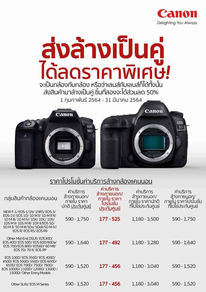 แคนนอน ต้อนรับเทศกาลแห่งความรัก จัดโปรโมชั่นสุดพิเศษ “ส่งล้างเป็นคู่” ชวนลูกค้ามาใช้บริการล้างทำความสะอาดกล้องและเลนส์ ณ ศูนย์บริการสำนักงานใหญ่ อาคารสาทรสแควร์ กรุงเทพฯ เพียงเลือกจับคู่สินค้าไม่ว่าจะเป็น กล้องคู่กล้อง หรือจะเป็น เลนส์คู่เลนส์ จะได้รับส่วนลดพิเศษ 50% ทันทีสำหรับค่าบริการในชิ้นที่สอง ผู้ที่สนใจสามารถใช้บริการตั้งแต่วันนี้-ถึงวันที่ 31 มีนาคม 2564 นี้เท่านั้น สอบถามข้อมูลเพิ่มเติมติดต่อได้ที่ Canon Call Center โทร 02-344-9988