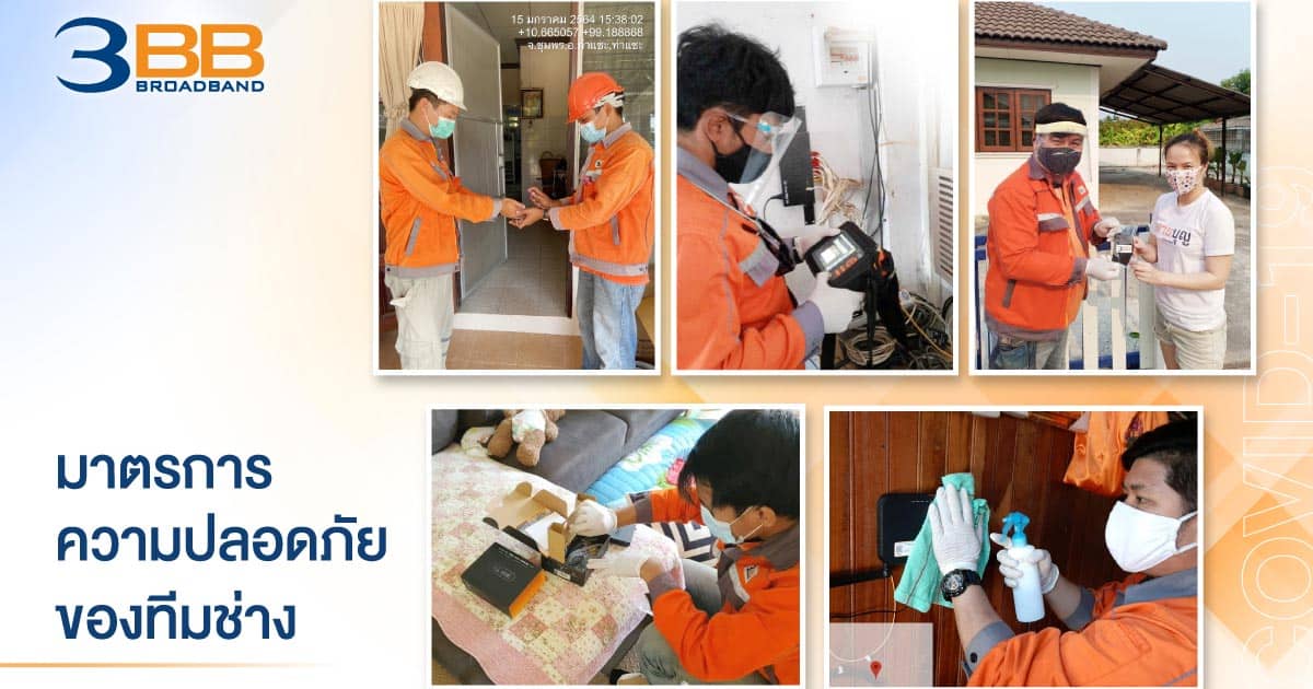 ส่วนการปฏิบัติงานของทีมช่างซึ่งจะต้องเดินทางไปติดตั้งหรือแก้ไขเหตุเสียที่บ้านลูกค้านั้น 3BB มีมาตรการป้องกันสูงสุดเพื่อลดความกังวลของลูกค้า โดยก่อนออกปฏิบัติงานทุกเช้า ช่างทุกคนจะต้องตรวจวัดอุณหภูมิร่างกาย สวมหน้ากากอนามัยและถุงมือ ทำความสะอาดอุปกรณ์ด้วยแอลกอฮอล์ทั้งก่อนและหลังติดตั้งเสร็จ ระมัดระวังไม่หยิบจับอุปกรณ์ของลูกค้าตลอดการทำงาน รวมทั้งทำความสะอาดมือทุกครั้งหลังปฏิบัติงาน