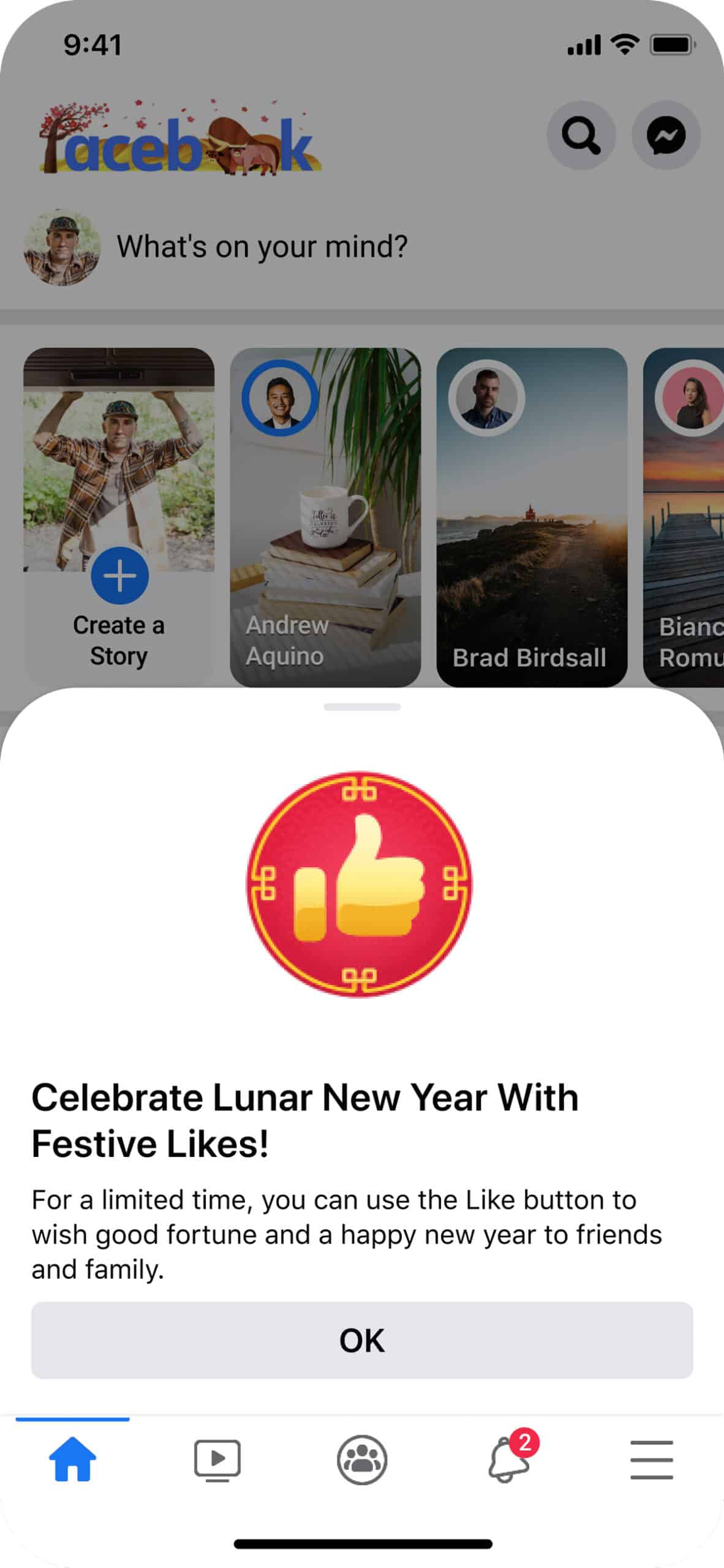 เพื่อร่วมเฉลิมฉลองความหลากหลายทางวัฒนธรรมนี้Facebook ได้เปิดตัวฟีเจอร์ใหม่ในธีมตรุษจีนมากมาย เพื่อต้อนรับการมาถึงของปีฉลู ไม่ว่าจะเป็น โลโก้ Facebook แบบตรุษจีนที่สามารถเลือกปรับแต่งได้ ปุ่มแสดงความรู้สึกในธีมตรุษจีน รวมถึงสติกเกอร์และเอ็ฟเฟ็กต์ AR ต่างๆ ทั้งบน Facebook และ Instagram Stories